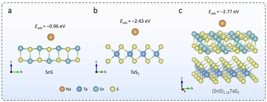 图6 计算得到的Na+在(a)(SnS)1.15TaS2、(b)TaS2和(c)SnS表面的吸附能(Eads)。