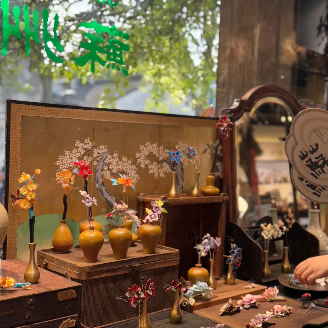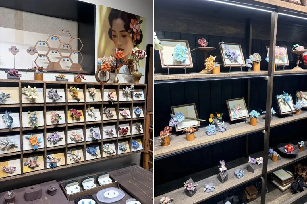 在南京有这样一个有名的绒花品牌——梧翊凰绒花,它的线下店位于老门东附近,游客们在游览的途中可以走进“梧翊凰”,在这里不仅能欣赏到精美的非遗展品,还能深入了解背后的故事。
