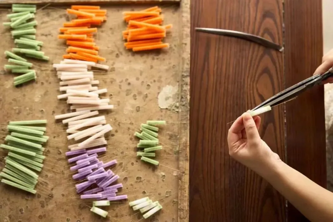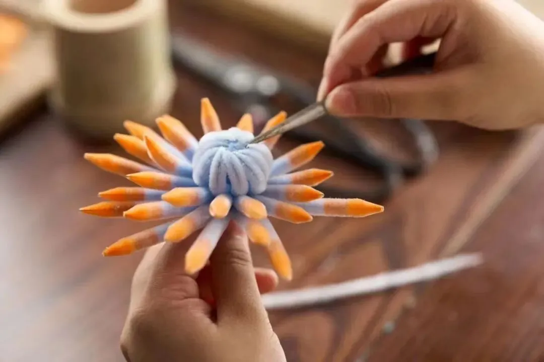 劈绒:将熟绒按0.1毫米宽度撕成细条(俗称“撕绒”),需手指配合镊子精准分离,确保绒丝均匀无结——这是决定绒花质感的关键,熟练工匠每日仅能劈绒数克。
