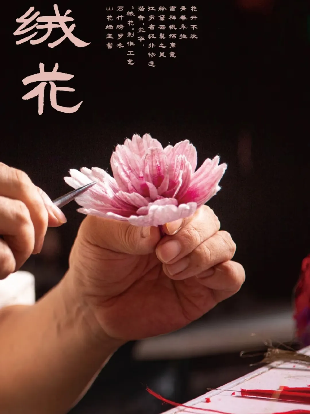 绒花,又称“宫花”“喜花”,是以优质蚕丝为原料,经劈绒、染色、塑形等工序制成的传统手工艺品,因造型逼真、色彩明丽、寓意吉祥,素有“发髻上的绽放”“永不凋零的花”之美誉。