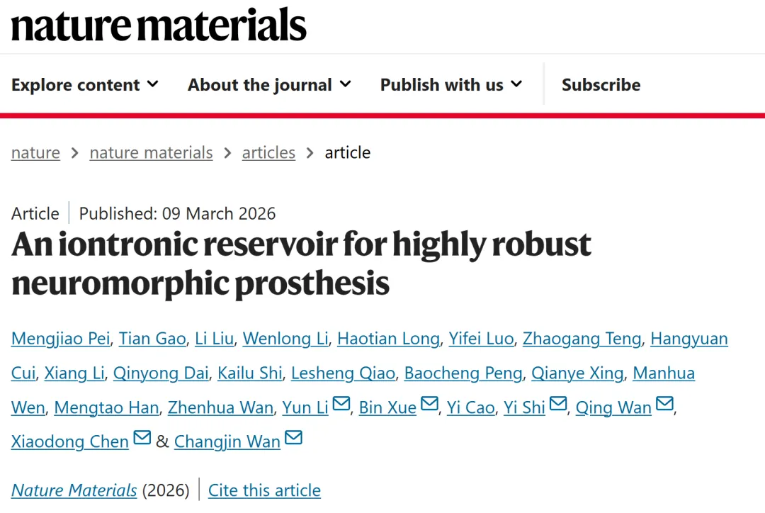 2026年3月9日,南京大学电子学院施毅院士团队万昌锦副教授联合新加坡南洋理工大学等科研单位,在《Nature Materials》发表题为“An iontronic reservoir for highly robust neuromorphic prosthesis”的研究论文(DOI: 10.1038/s41563-026-02532-7)。