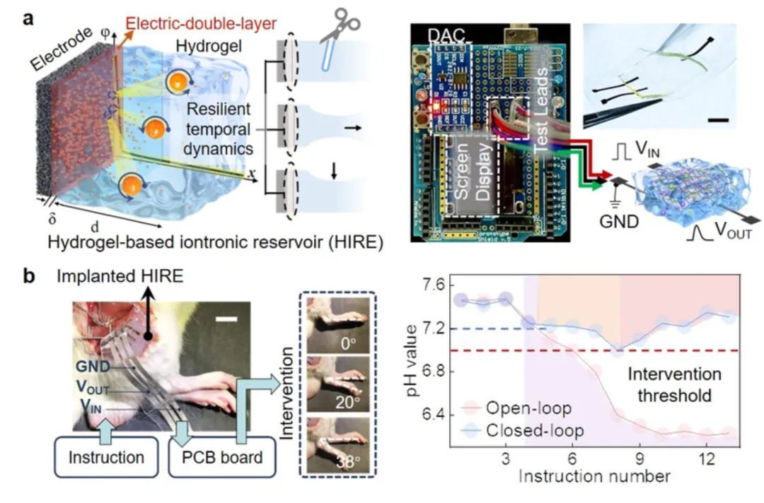 图. a) 界面电离子储备池计算概念(左)及测试系统(右);b) 闭环人工感觉运动回路(左)及指令-执行调控结果(右)。