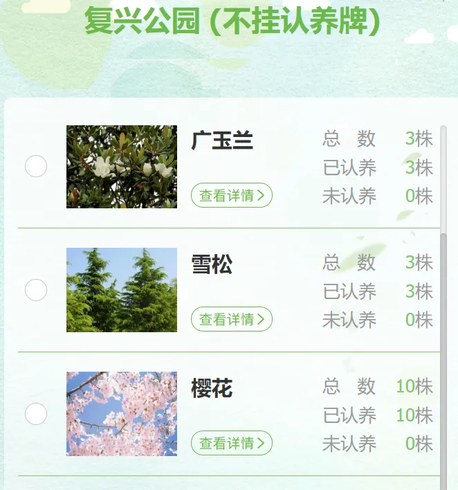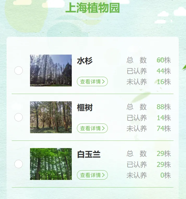 白玉兰是许多市民认养树木的首选。昨天11时,记者登录上海绿化认建认养平台,上海植物园29株白玉兰均已被认养,而辰山植物园刚开放认养没多久,100株木兰就已被认养了一半。