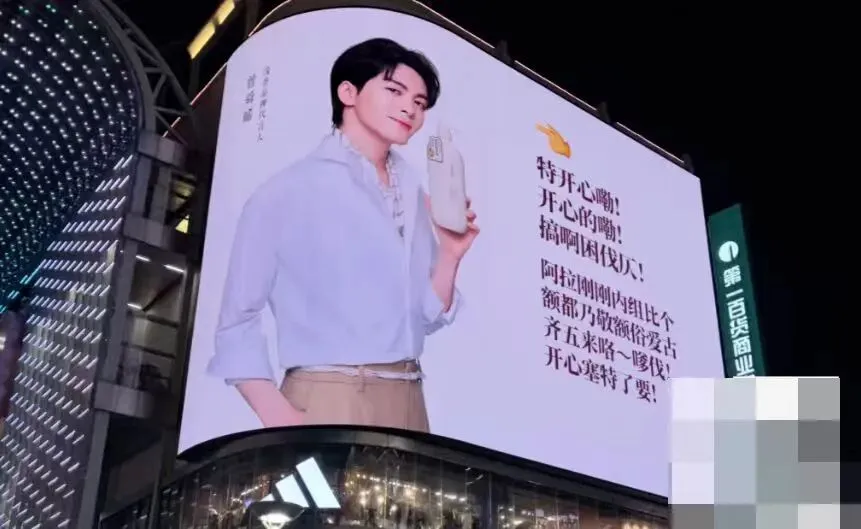 近日,最近,南京路步行街第一百货大楼的电子大屏幕打出一幅巨幅广告。画面中,艺人展示商品,旁侧配有一串文字,被网友戏称为“像摩斯密码一般”。