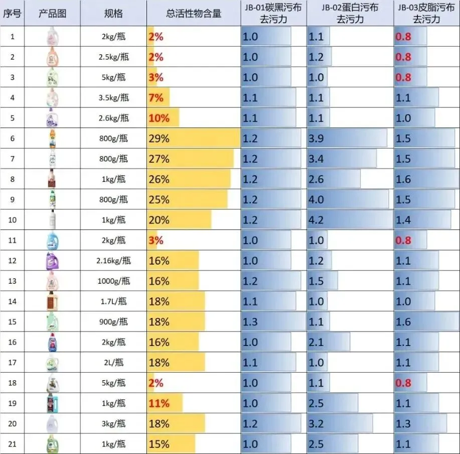 以汰渍碧浪为代表的新兴“洗衣原液”、The laundress经典洗衣液等4款产品表现突出,总活性物含量最高达到29%,远超行业标准所要求的15%。上下滑动查看检测数据↓↓
