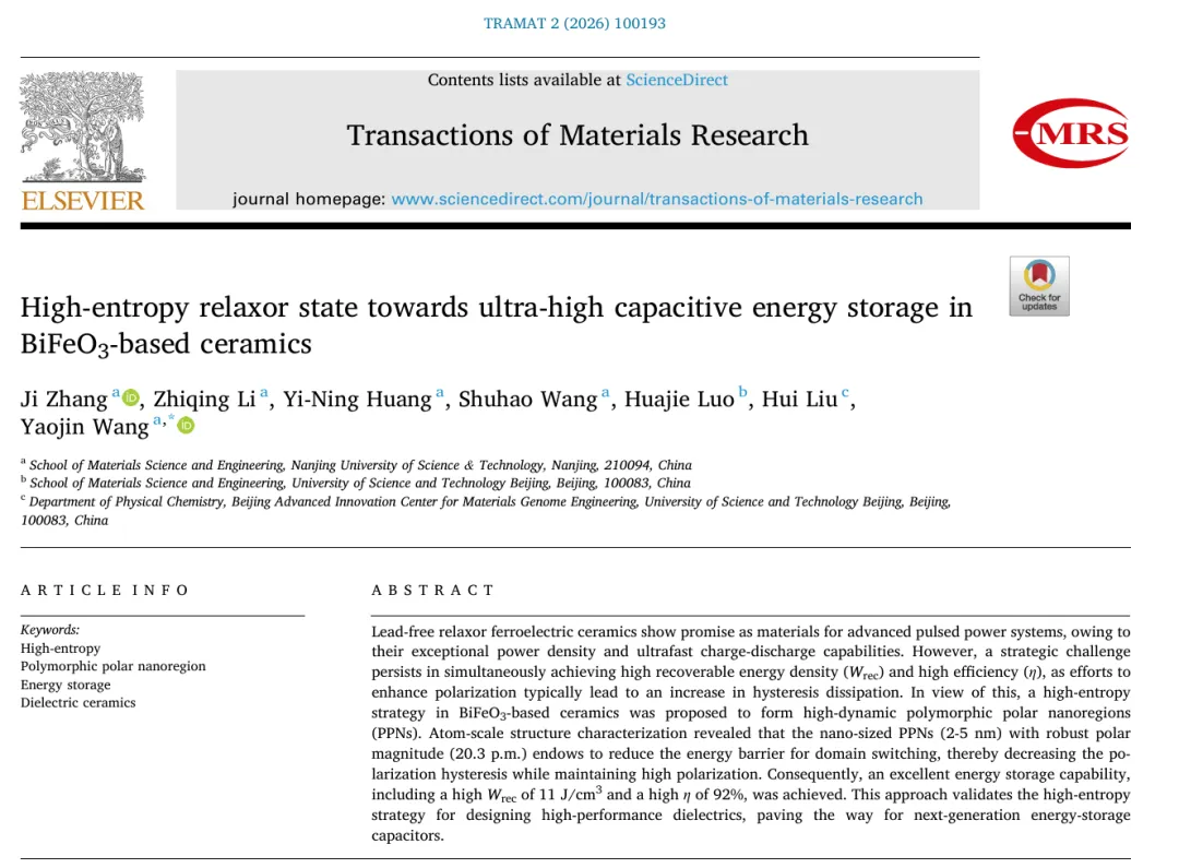 近日,南京理工大学Ji Zhang,汪尧进Yaojin Wang等在Transactions of Materials Research上发文,在BiFeO₃基陶瓷中,提出了高熵策略,成功构建了高动态多态极性纳米微区polymorphic polar nanoregions (PPNs)。