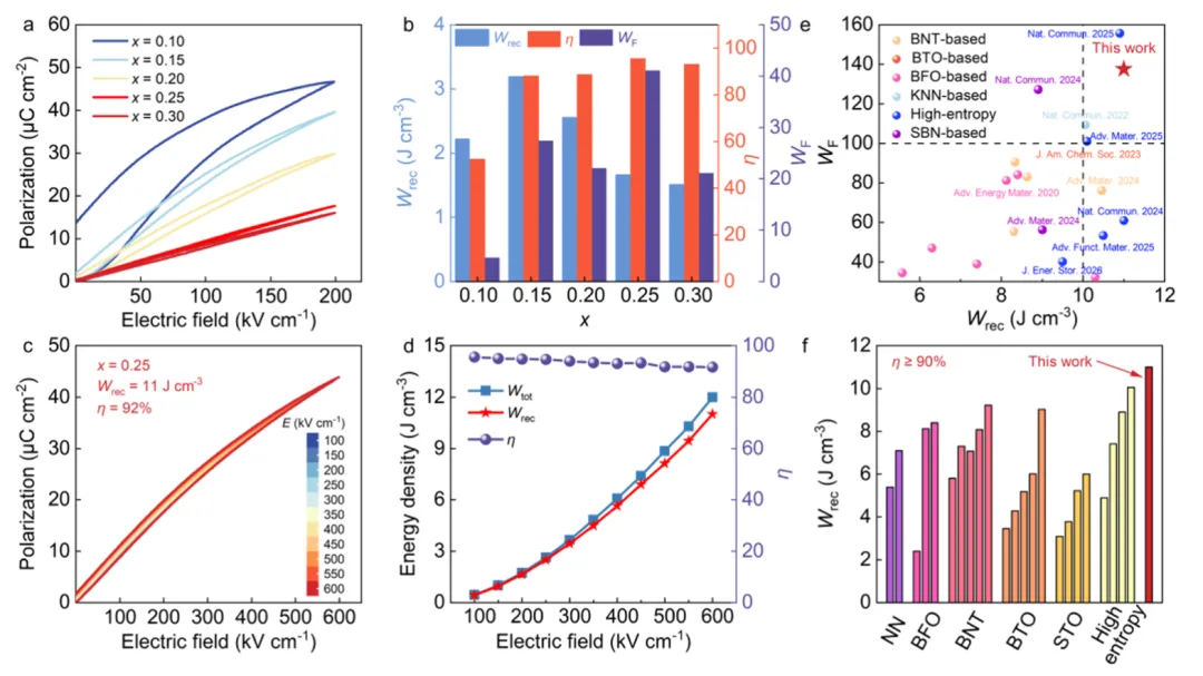 无铅弛豫铁电陶瓷ferroelectric ceramics,因其卓越的功率密度和超快充放电能力,在先进脉冲功率系统中展现出应用潜力。然而,在保持高储能密度的同时,如何实现高效率,仍是关键挑战:因为提升极化强度,往往会增加迟滞损耗。