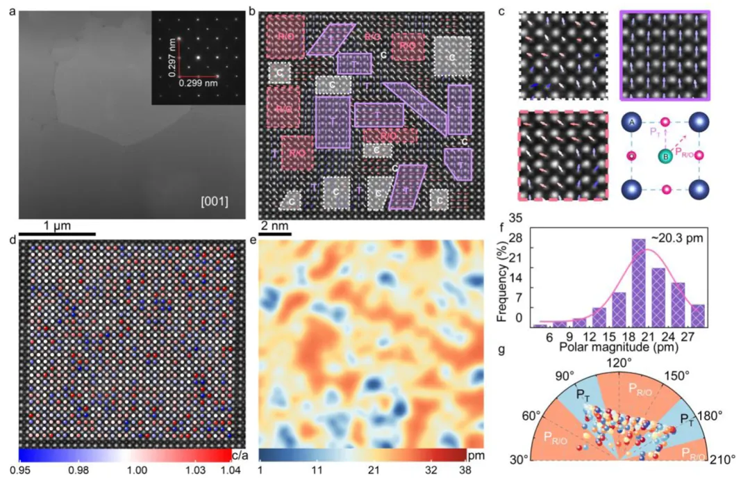 原子尺度结构表征表明,具有强极性幅度(20.3 pm)的纳米级多态极性纳米微区,可以降低畴翻转能垒,从而在维持高极化的同时减小极化迟滞。最终实现了优异的储能性能:高达11 J/cm³的储能密度与92%的储能效率。