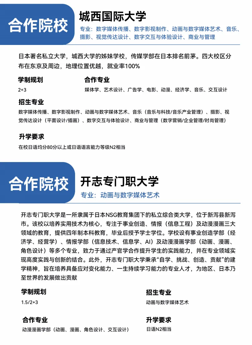 学生在我校国际学院全日制学习前1.5/2年出国留学预备课程后,凭课程结业证书及留学外语成绩(免留考),将升入与我校建立校际合作关系的日本大学续读本科后续课程。海外大学