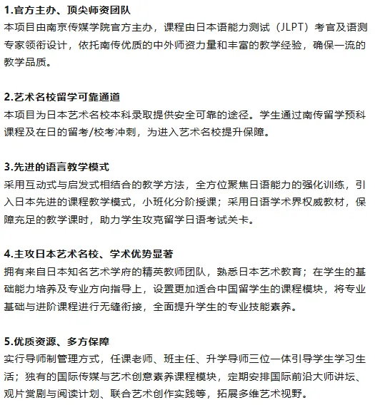 作为南京传媒学院直属的归口负责国际教育的教学单位,南传国际学院深耕艺术留学领域,是中国教育国际交流协会会员单位,并联合多所海外顶尖传媒艺术名校,开展国际本科/预科项目,致力于为学生提供全方位、高品质的国际化教育服务,现面向全国招收有意向出国留学就读本科的学生。
