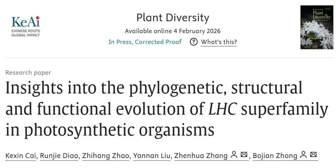 Kexin Cai, Runjie Diao, Zhihang Zhao, Yannan Liu, Zhenhua Zhang, Bojian Zhong. 2026. Insights into the phylogenetic, structural and functional evolution of LHC superfamily in photosynthetic organisms. Plant Diversity, https://doi.org/10.1016/j.pld.2026.01.004.
