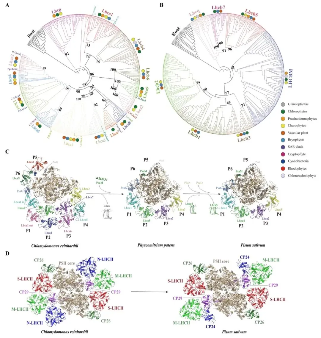 图2.PSI和PSII的系统发育及结构分析。(A)LHCA 亚家族的系统发育树。(B)LHCB 亚家族的系统发育树。(C)从左至右分别为PDB数据库中已解析的绿藻莱茵衣藻、苔藓小立碗藓和被子植物豌豆的PSI-LHCI结构。(D)从左至右分别为PDB数据库中已解析的莱茵衣藻和小立碗藓的PSII-LHCII复合物。