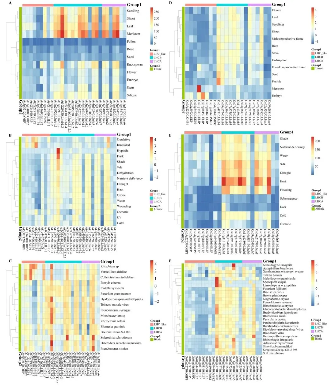 图3. 拟南芥和水稻中LHC基因的表达谱。(A - C)拟南芥中LHC基因的组织特异性表达、非生物胁迫表达和生物胁迫表达谱。(D - F)水稻中LHC基因的组织特异性表达、非生物胁迫表达和生物胁迫表达谱。
