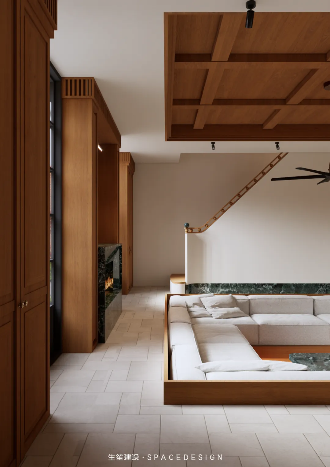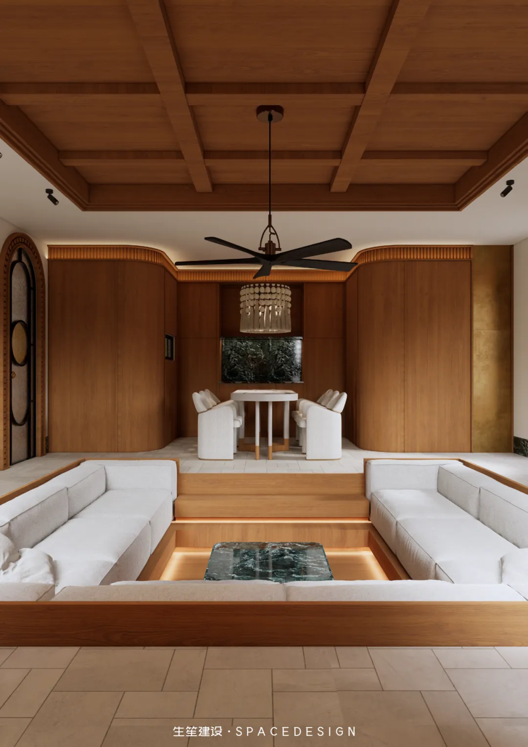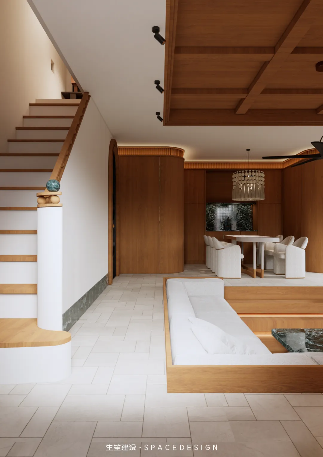 整个项目我们以设计为桥,连接民国建筑的风骨与当代生活的松弛,不执着于技法的繁复,不纠结于尺度的精准,只让空间成为情绪的载体,让每一寸肌理都呼应居者对生活的赤诚。设计隐于幕后,让生活站上C位,并摒弃刻意的改造技法,以浅暖灰为生活底色,以柚木为时光注脚,用复古的底蕴碰撞当代的舒适。下沉式的格局,是对生活节奏的慢放;圆润的线条,是对棱角人生的柔化;光影与材质交织,勾勒出空间的情绪,也映照出居者克制、从容、自带质感的生活哲学.