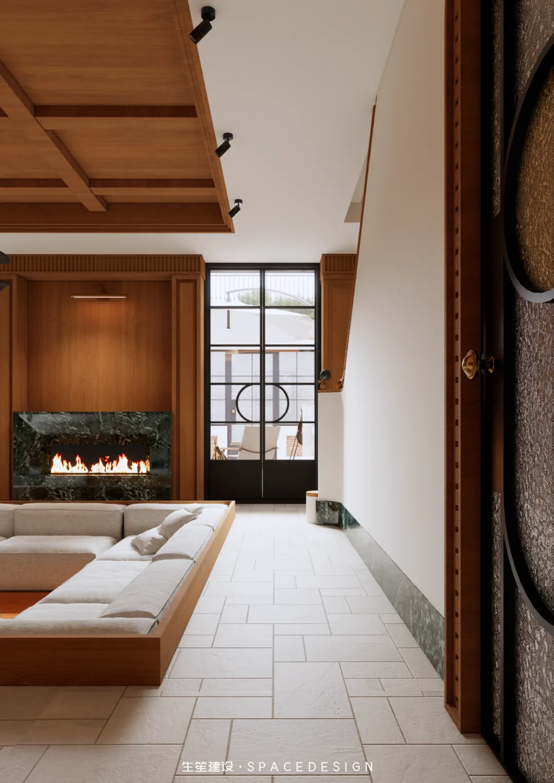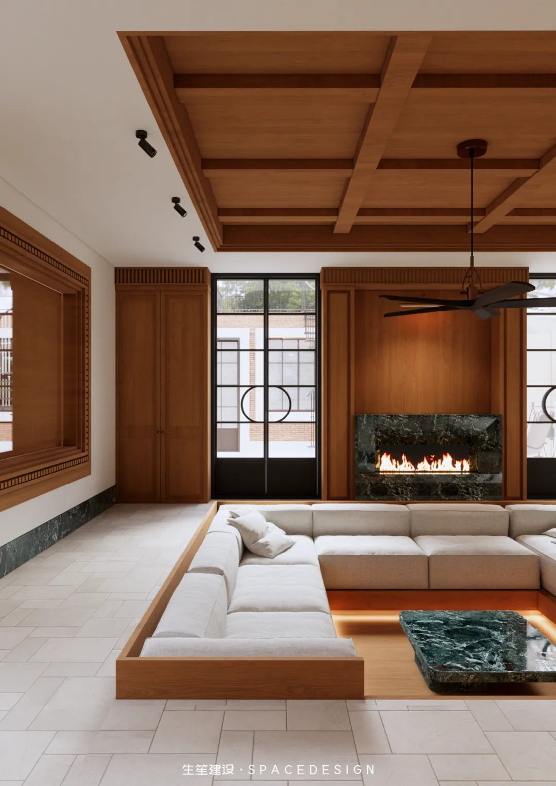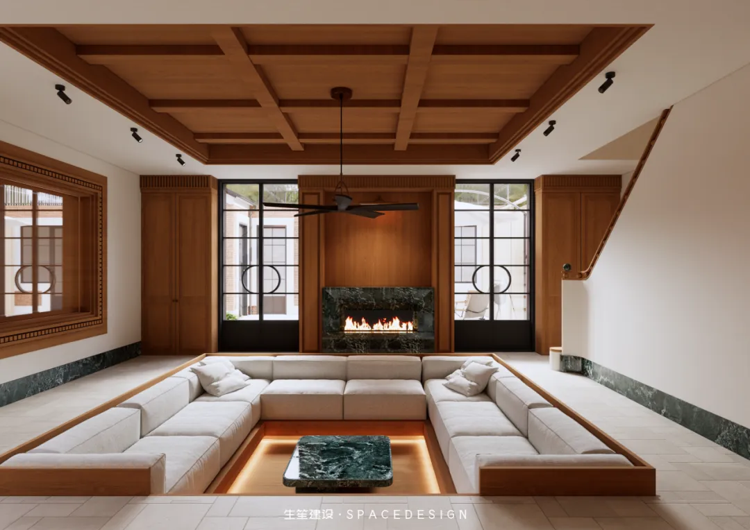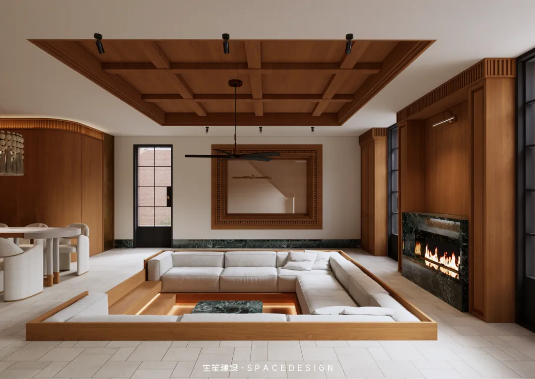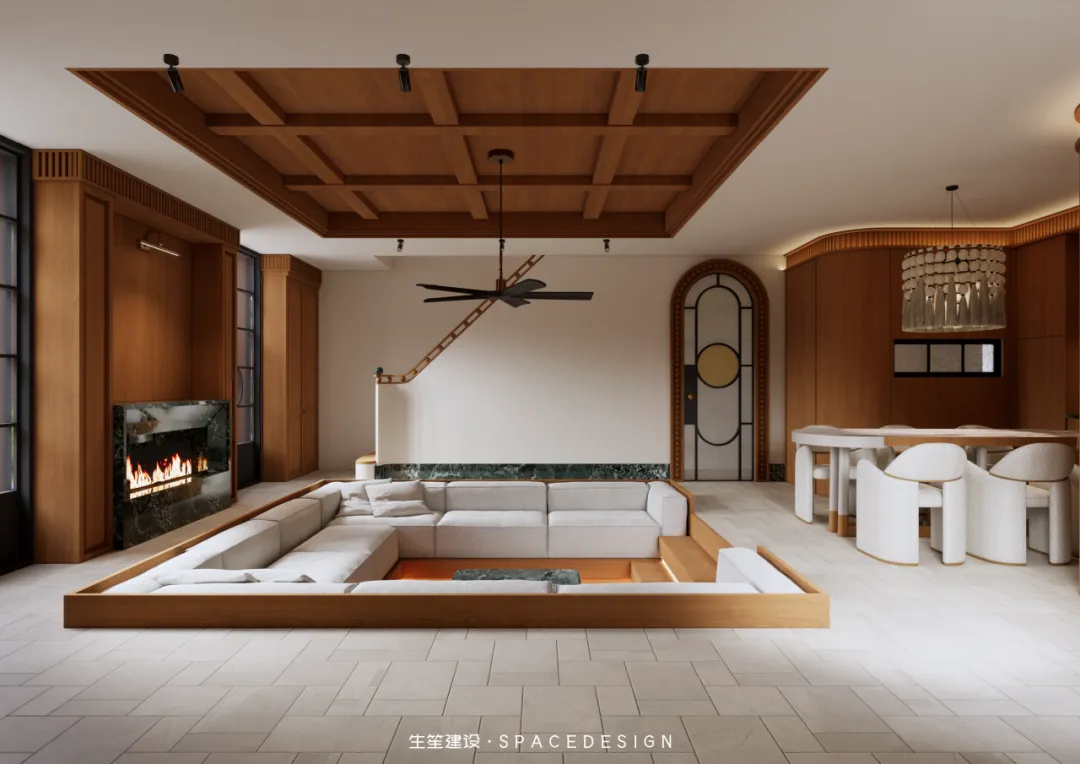下沉式格局围合出专属天地,木质吊顶勾勒层次,白色布艺沙发柔软包裹,壁炉暖光摇曳,将岁月的温暖揉进空间。大理石茶几映着光影,木质柜体藏着收纳,这里是家人围坐闲谈的主场,是挚友小聚畅聊的角落,无需刻意雕琢,每一刻的松弛与惬意,都是生活最好的模样。
