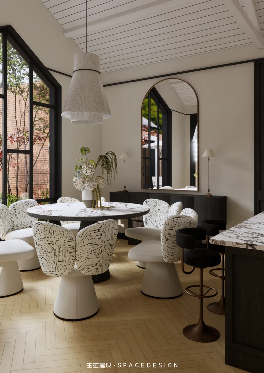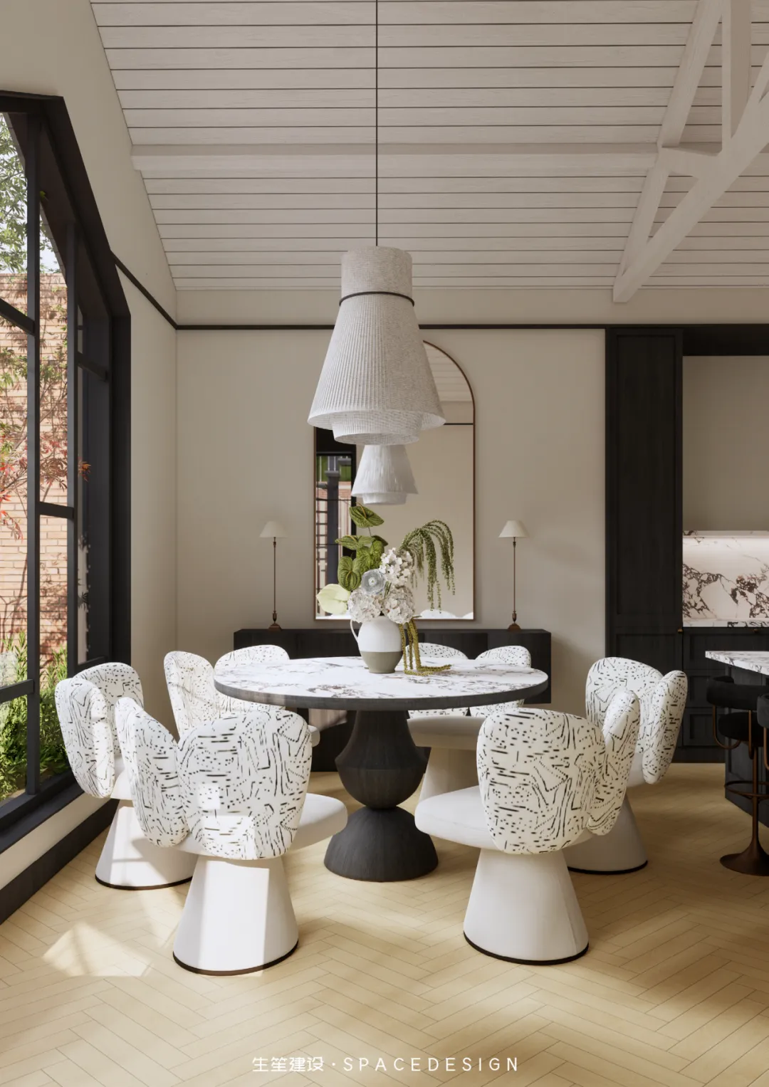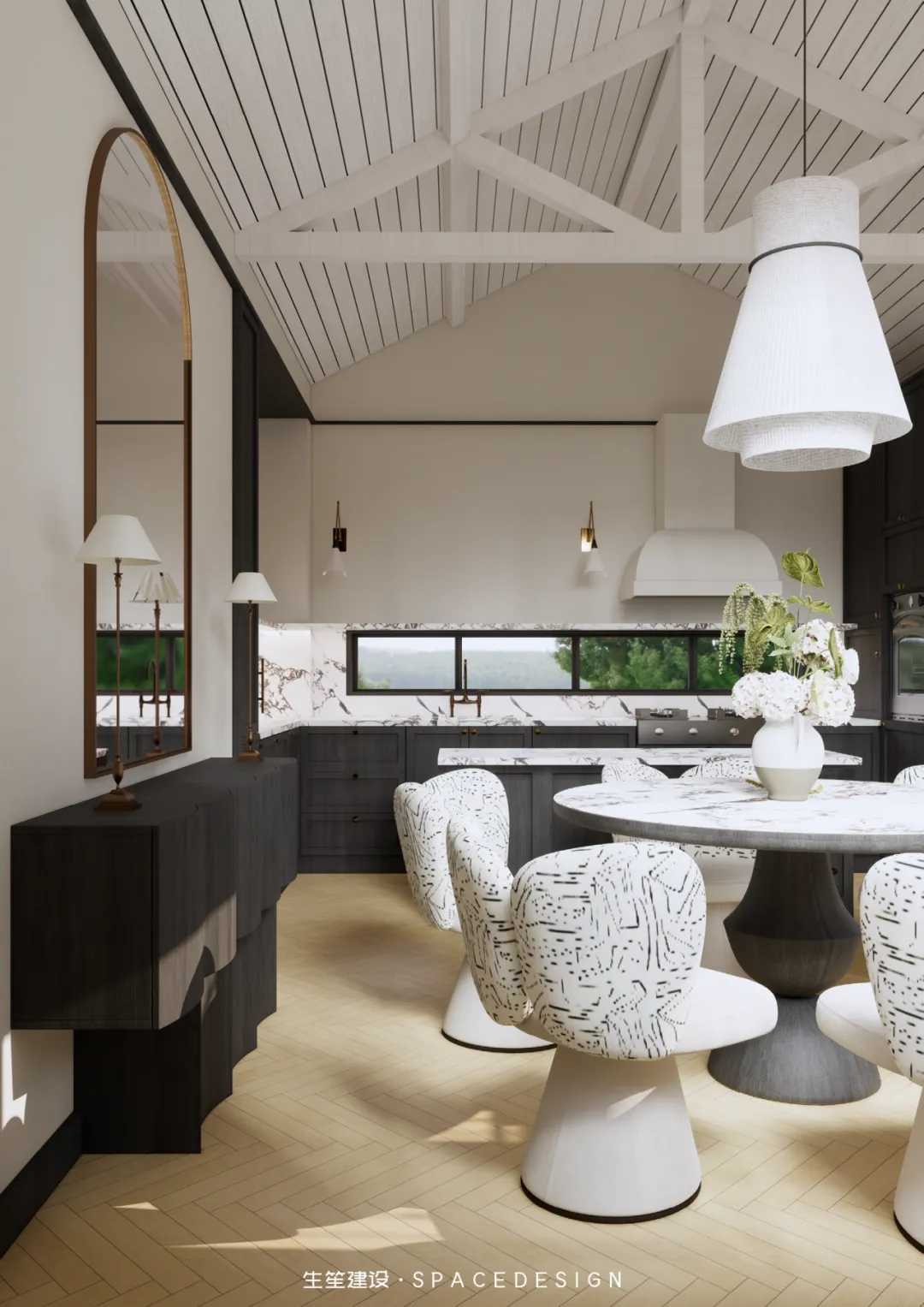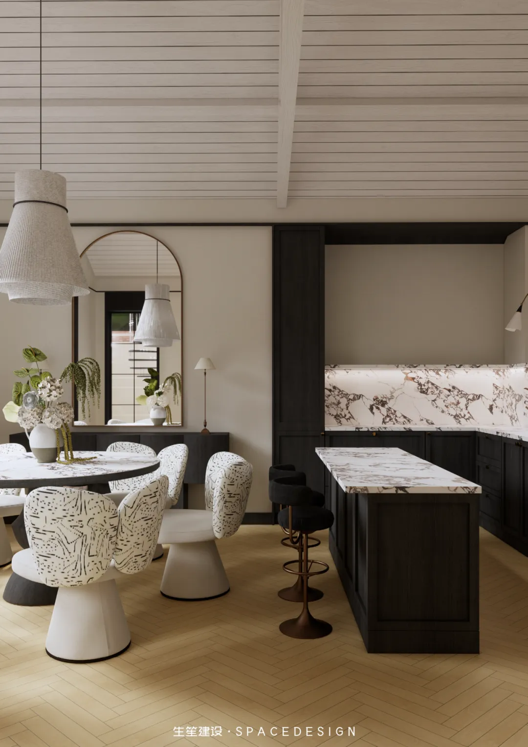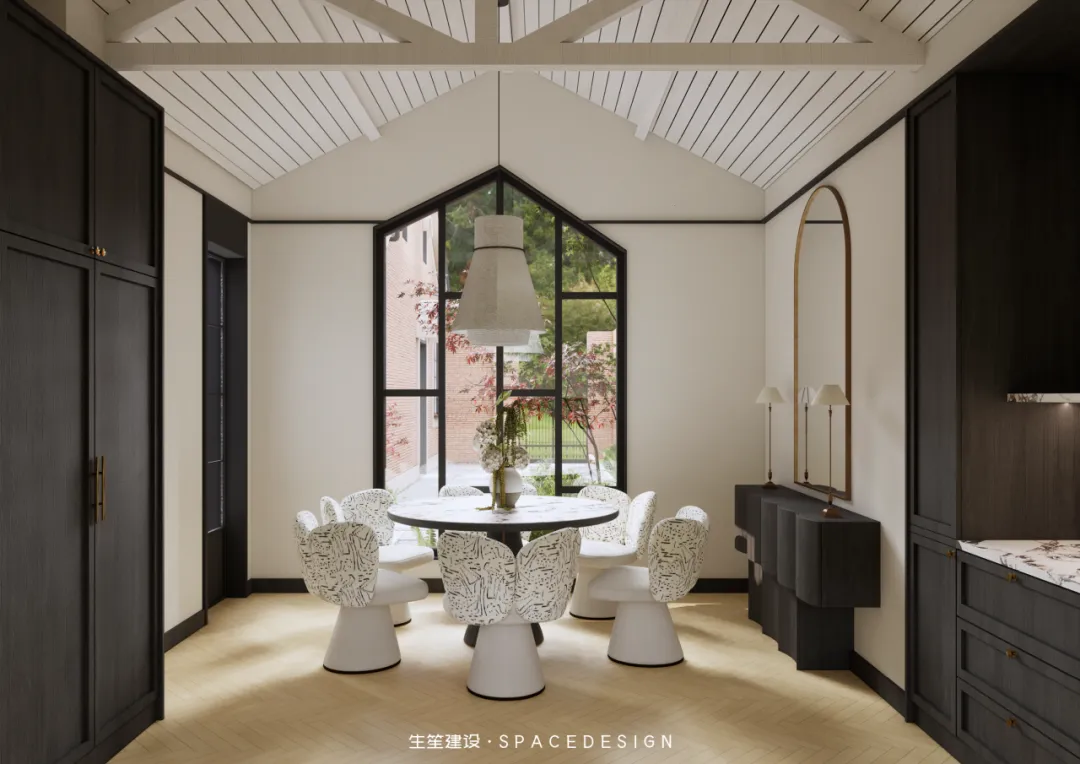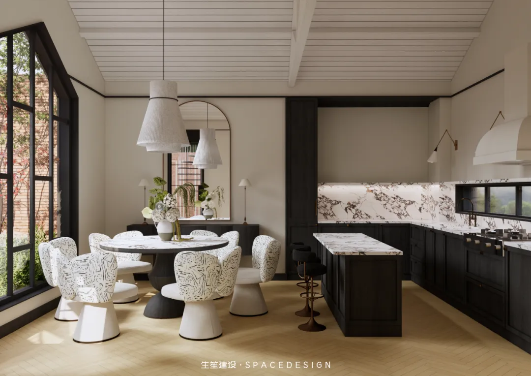 大理石圆桌承托着三餐四季,纹理间藏着时光的温柔;柚木橱柜与大理石台面相融,复古质感中透着生活的温度。拱形镜映出光影流转,白色布艺餐椅以圆润线条消解生硬,在这里,烹饪是治愈,围坐是陪伴,每一次烟火升腾,都是生活最动人的叙事。