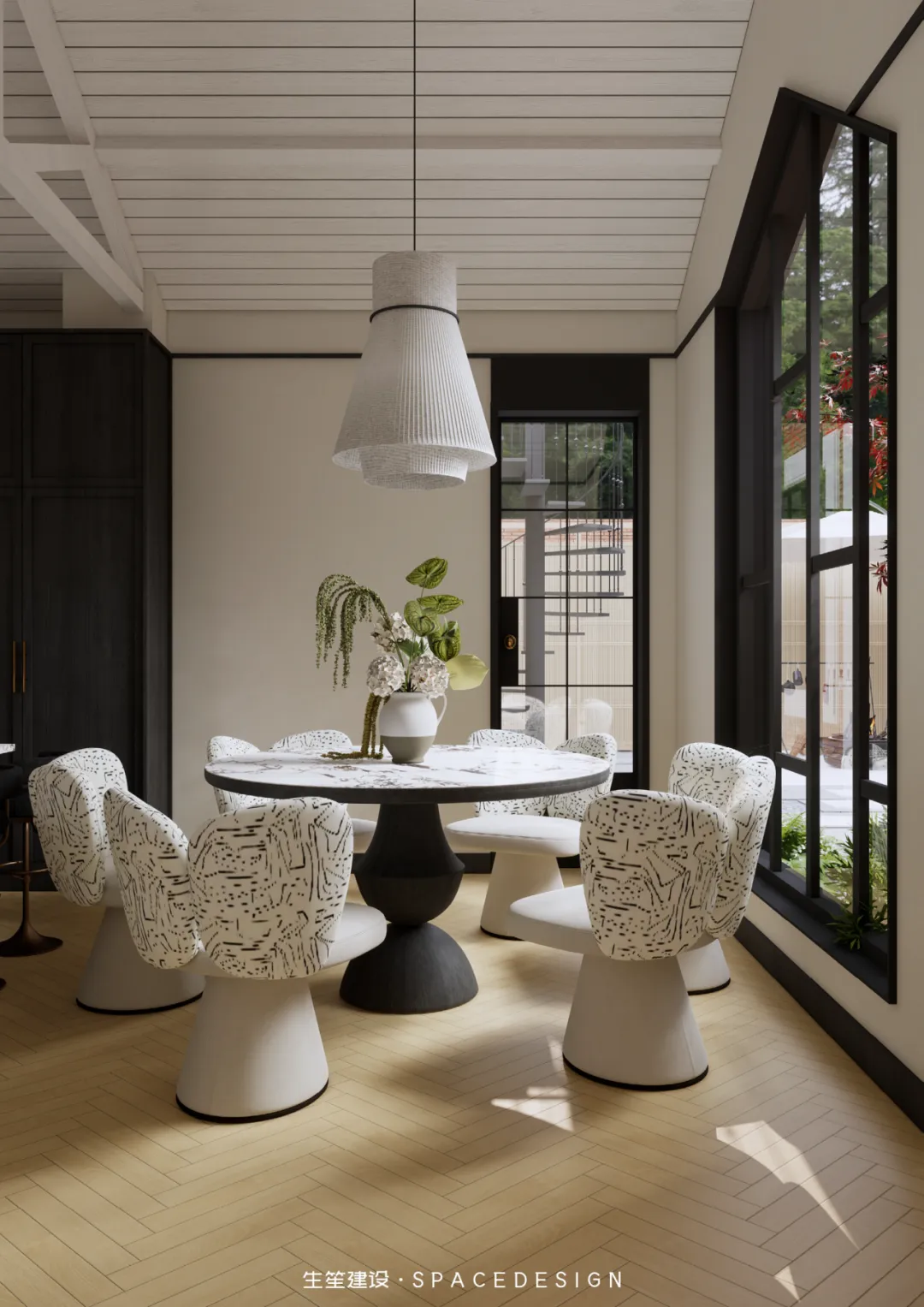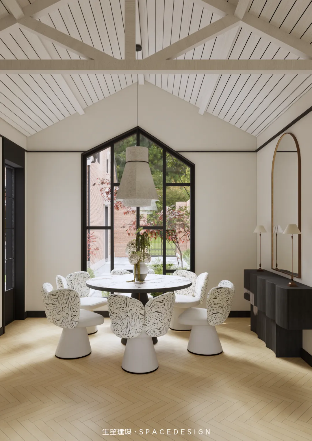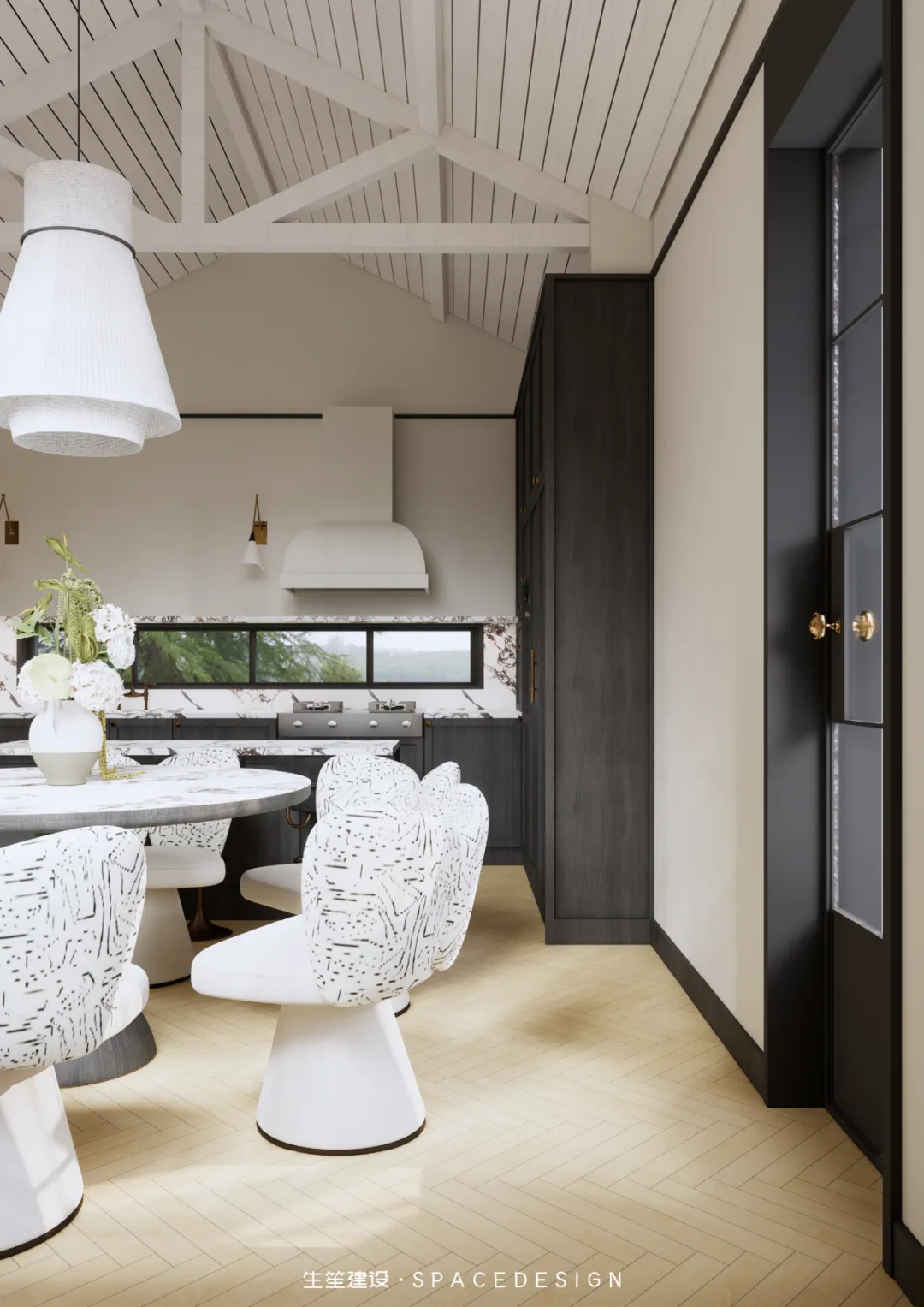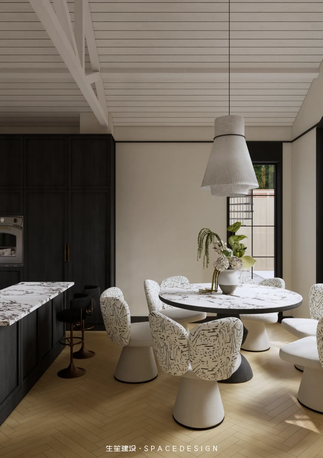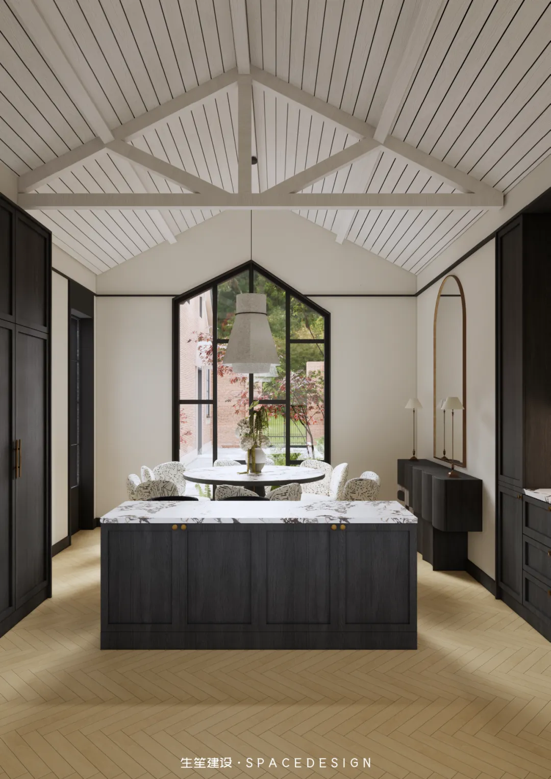 大理石圆桌承托着三餐四季,纹理间藏着时光的温柔;柚木橱柜与大理石台面相融,复古质感中透着生活的温度。拱形镜映出光影流转,白色布艺餐椅以圆润线条消解生硬,在这里,烹饪是治愈,围坐是陪伴,每一次烟火升腾,都是生活最动人的叙事。