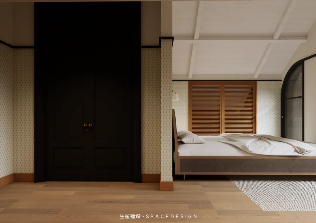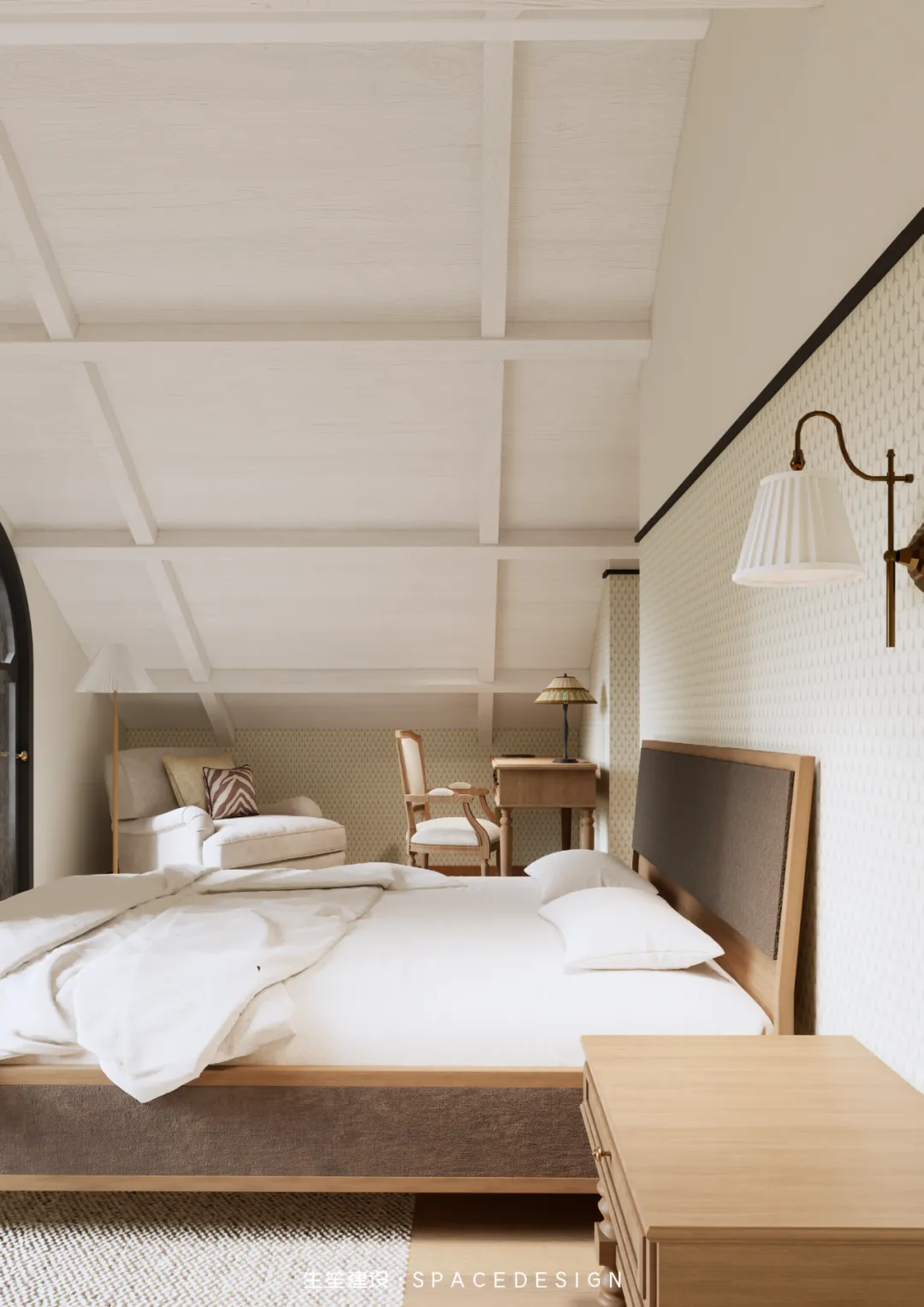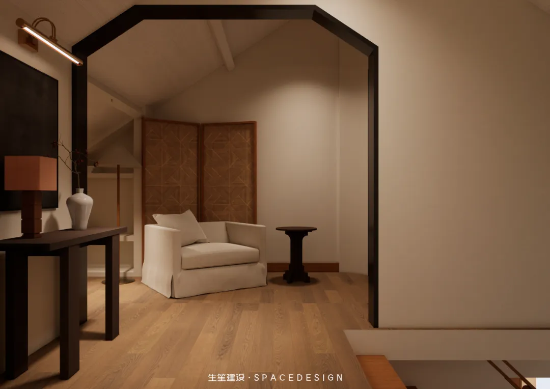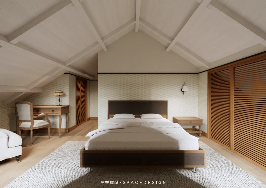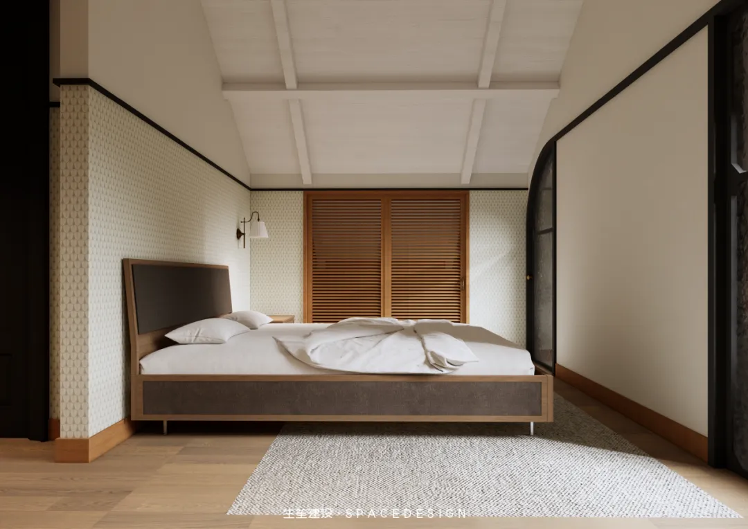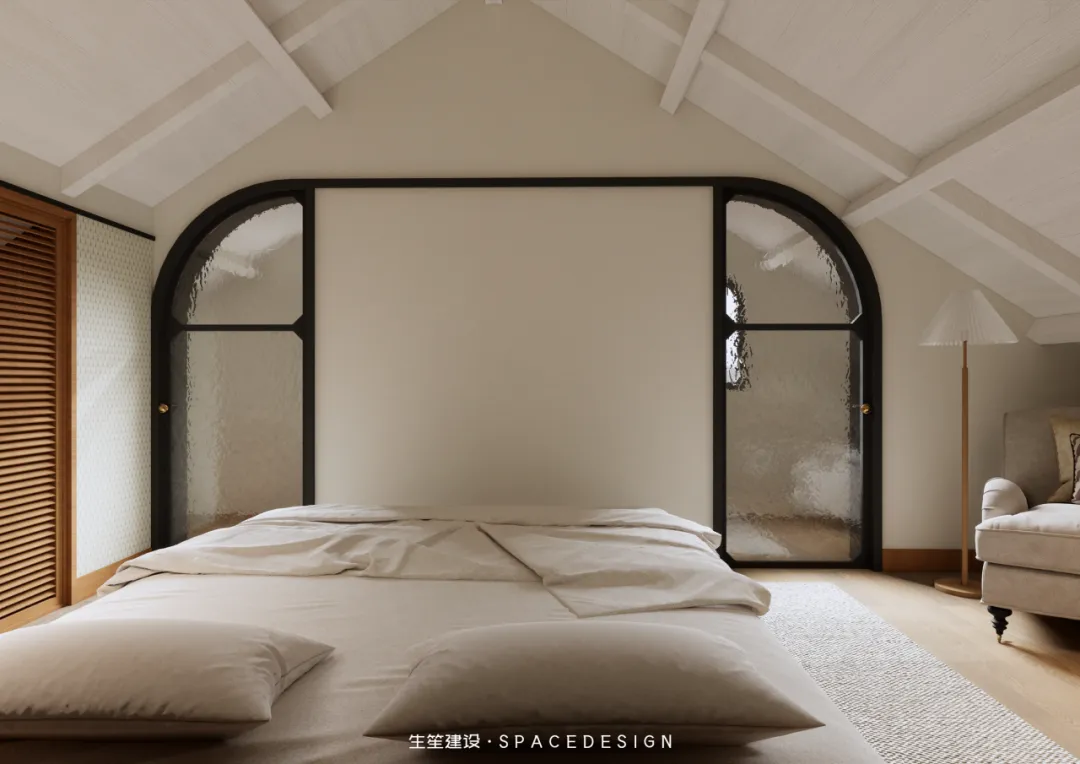 斜顶之下,浅暖灰铺就温柔底色,木质床架与布艺软包相融,将民国建筑的雅致藏进睡眠时光。拱形玻璃隔断隔绝喧嚣,却留住暖阳与清风,侧边休憩角摆上柔软座椅,一盏壁灯、一方小几,便是卸下疲惫的私享天地。在这里,时光缓慢流淌,身心全然松弛,每一次入眠,都是与自我的温柔相拥。
