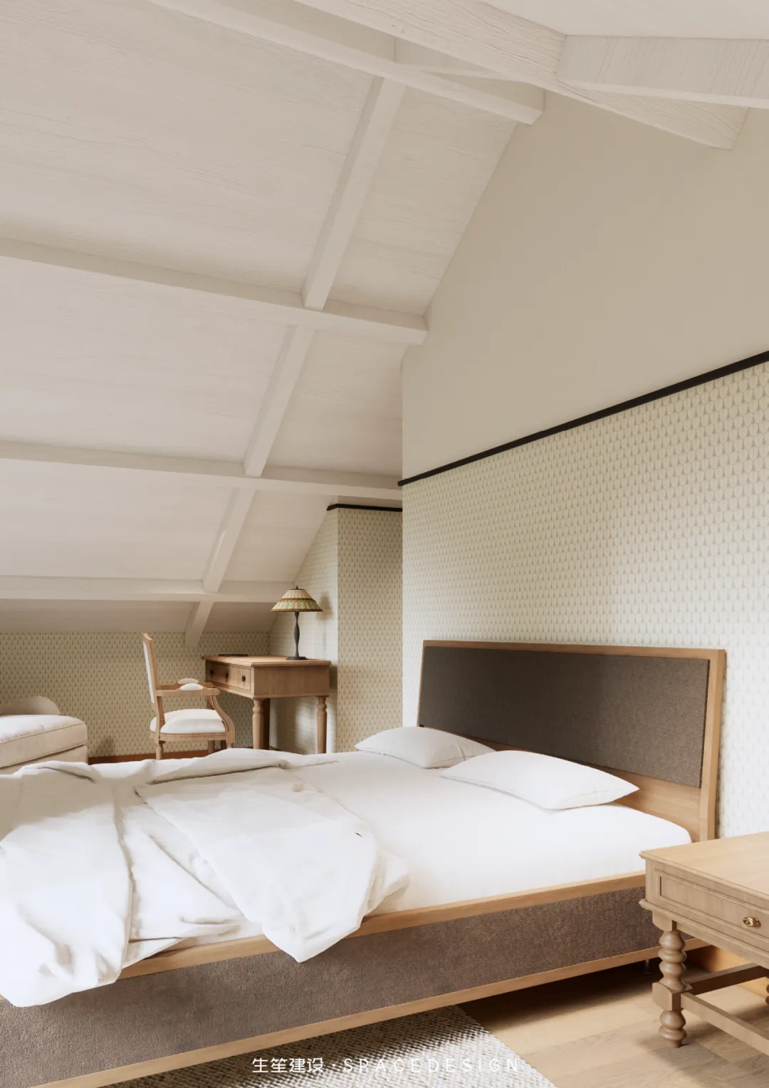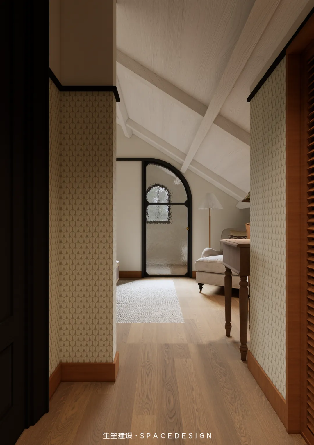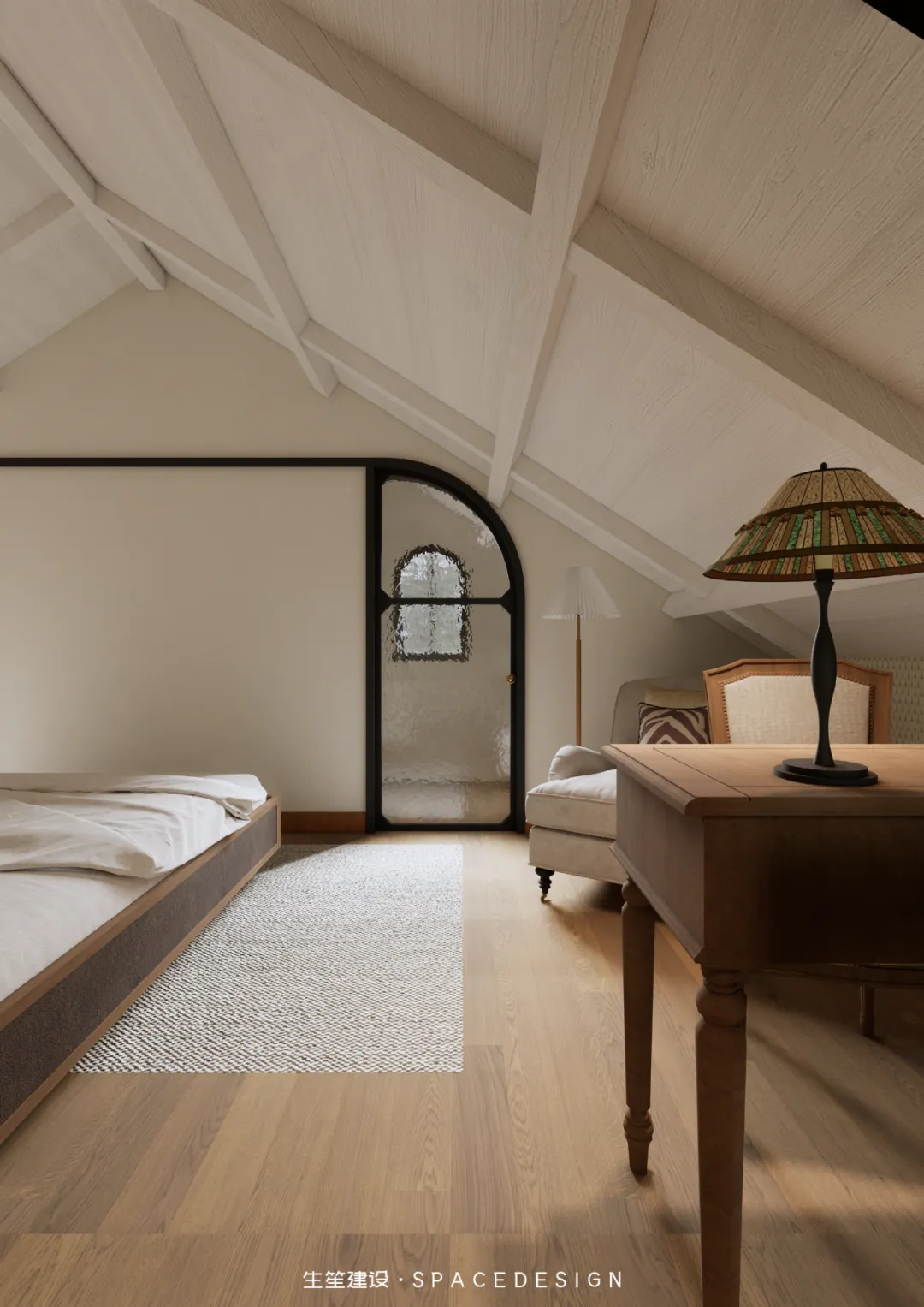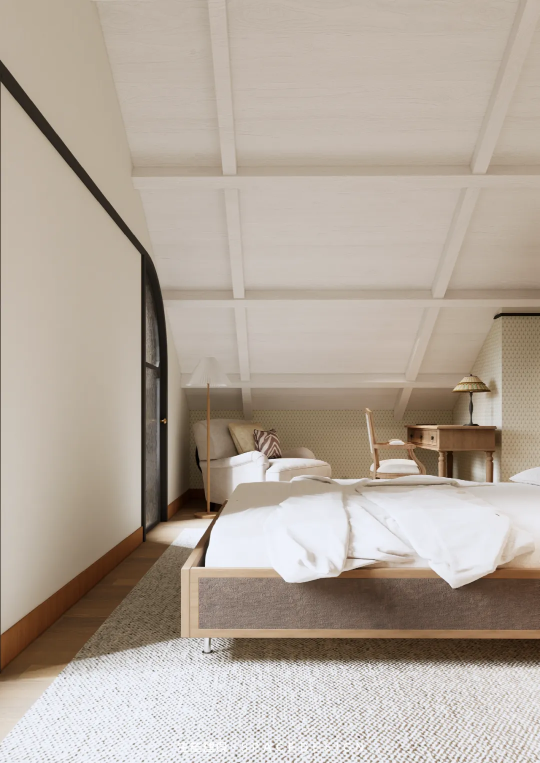 斜顶之下,浅暖灰铺就温柔底色,木质床架与布艺软包相融,将民国建筑的雅致藏进睡眠时光。拱形玻璃隔断隔绝喧嚣,却留住暖阳与清风,侧边休憩角摆上柔软座椅,一盏壁灯、一方小几,便是卸下疲惫的私享天地。在这里,时光缓慢流淌,身心全然松弛,每一次入眠,都是与自我的温柔相拥。
