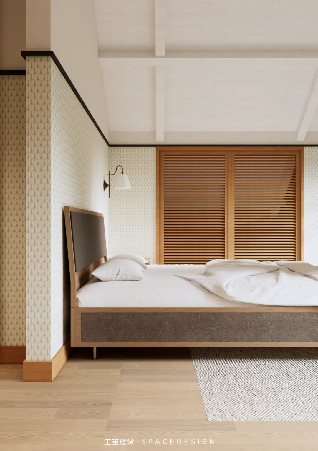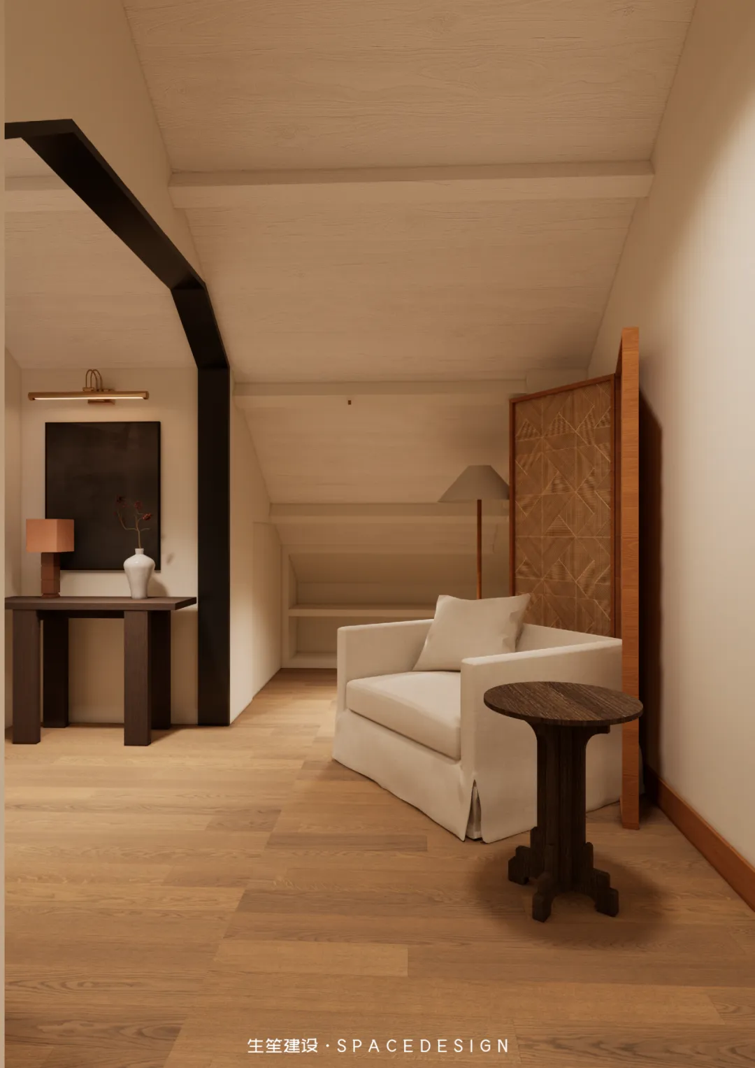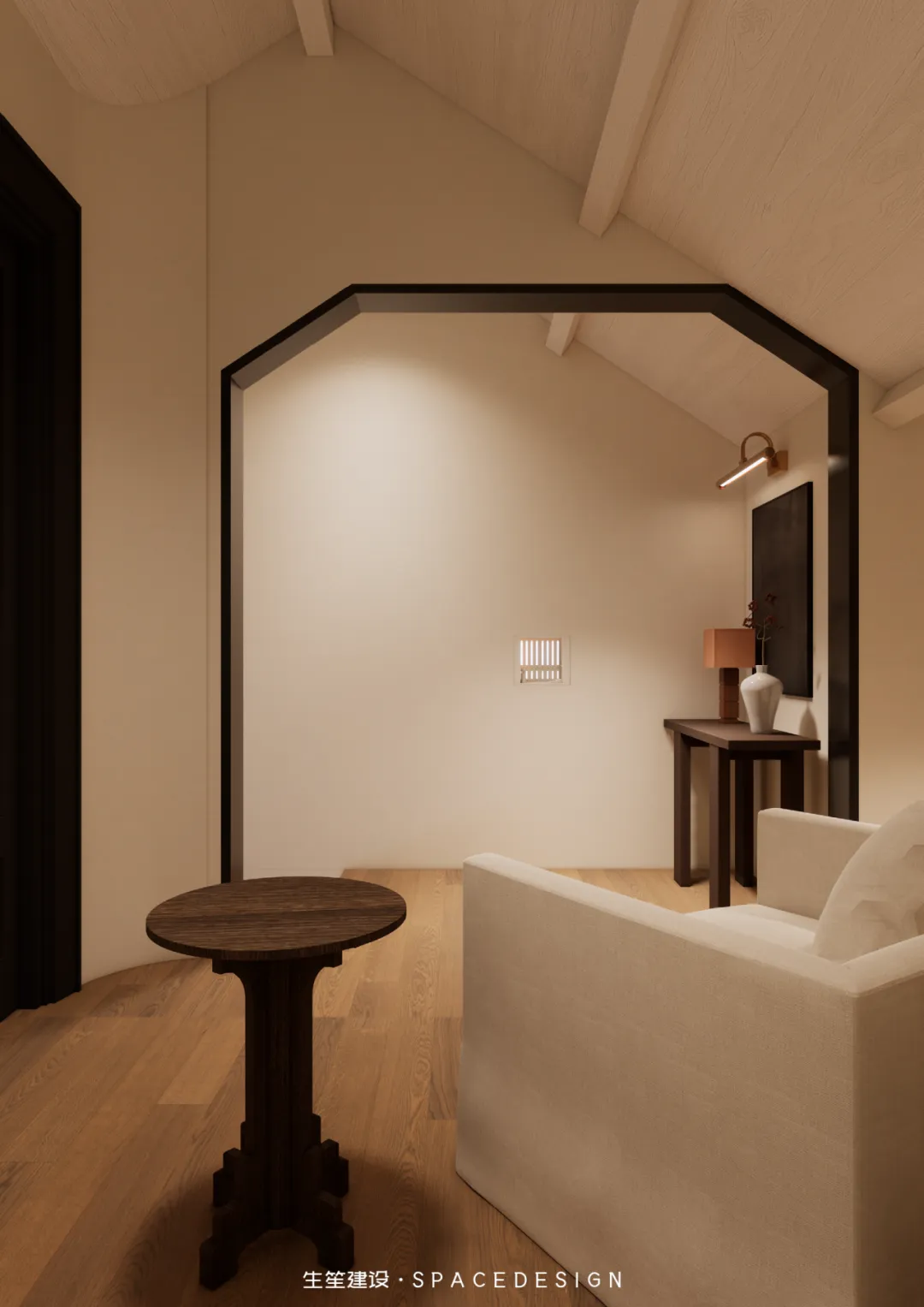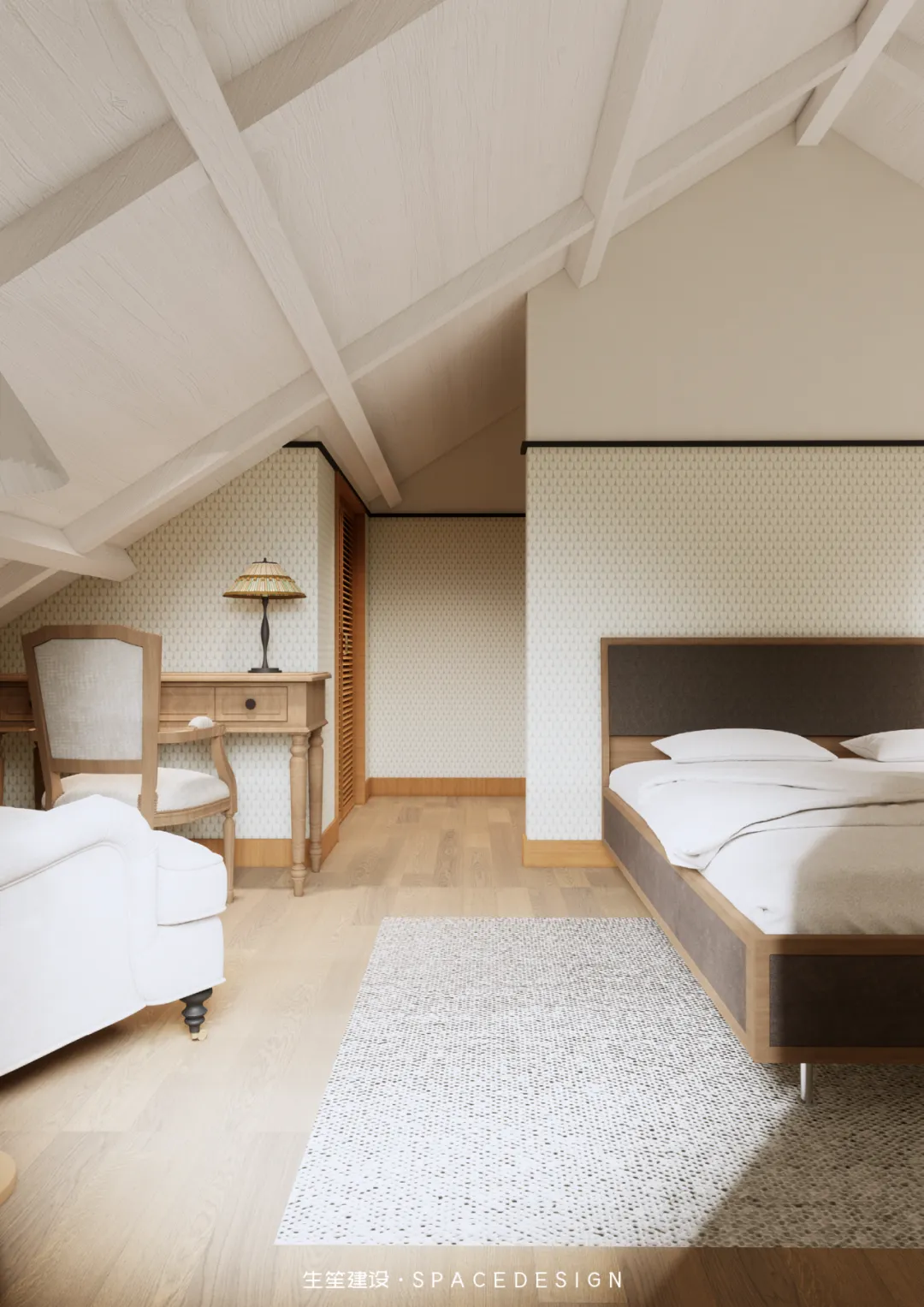 斜顶之下,浅暖灰铺就温柔底色,木质床架与布艺软包相融,将民国建筑的雅致藏进睡眠时光。拱形玻璃隔断隔绝喧嚣,却留住暖阳与清风,侧边休憩角摆上柔软座椅,一盏壁灯、一方小几,便是卸下疲惫的私享天地。在这里,时光缓慢流淌,身心全然松弛,每一次入眠,都是与自我的温柔相拥。