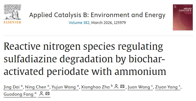 Jing Dai, Ning Chen, Yujun Wang, Xianghao Zha, Juan Wang, Ziyan Yang, Guodong Fang, Reactive nitrogen species regulating sulfadiazine degradation by biochar-activated periodate with ammonium, Applied Catalysis B: Environment and Energy, 2026, https://doi.org/10.1016/j.apcatb.2025.125979