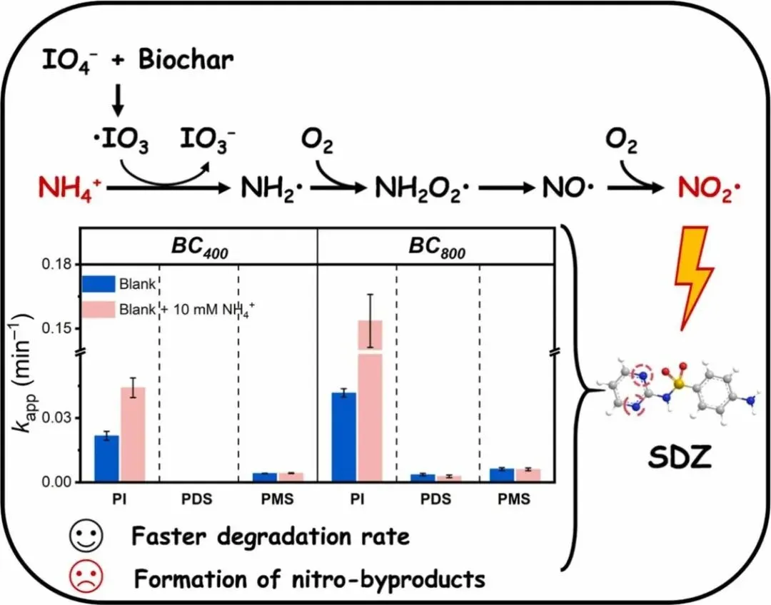 本研究选取磺胺嘧啶(SDZ)作为模型污染物,该物质是一种在多种环境基质中常被检测到的磺胺类抗生素[25],旨在探究NH₄⁺对BC/PI系统中SDZ降解的影响。随后采用原位与非原位表征技术组合,包括化学淬灭实验、电子顺磁共振(EPR)光谱及电化学分析,以鉴定BC/PI系统和BC/PI/NH4+系统中的主导活性物种。此外,通过密度泛函理论(DFT)计算阐明了涉及不同活性物种的SDZ降解途径的热力学可行性。最终通过液相色谱-四极杆飞行时间质谱(LC-QTOF-MS)鉴定氧化过程中生成的硝基副产物,并运用ECOSAR预测模型评估其环境风险。