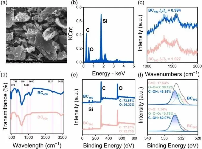 Fig. 1. (a-b) SEM image and EDX elemental mapping of BC800, (c) Raman spectra, (d) FT-IR patterns, (e) XPS survey spectra, and (f) high-resolution O 1 s XPS spectra of BC400 and BC800.