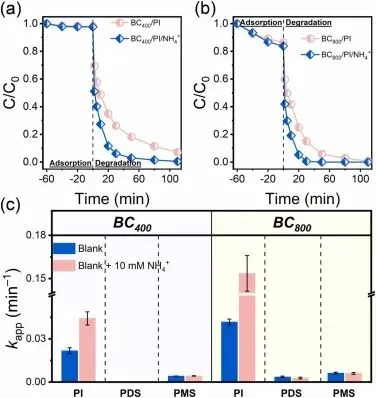 Fig. 2. Effects of NH4+ on SDZ elimination in (a) BC400/PI and (b) BC800/PI systems, (c) comparative analysis of NH4+ influence on SDZ degradation rates across different BC-AOPs systems. (Experimental conditions: [BC] = 0.2 g L−1, [SDZ] = 20 μM, [oxidants] = 0.25 mM, [NH4Cl] = 10 mM for BC/PI systems, [(NH4)2SO4] = 5 mM for BC/PDS and BC/PMS systems, initial pH: 7).