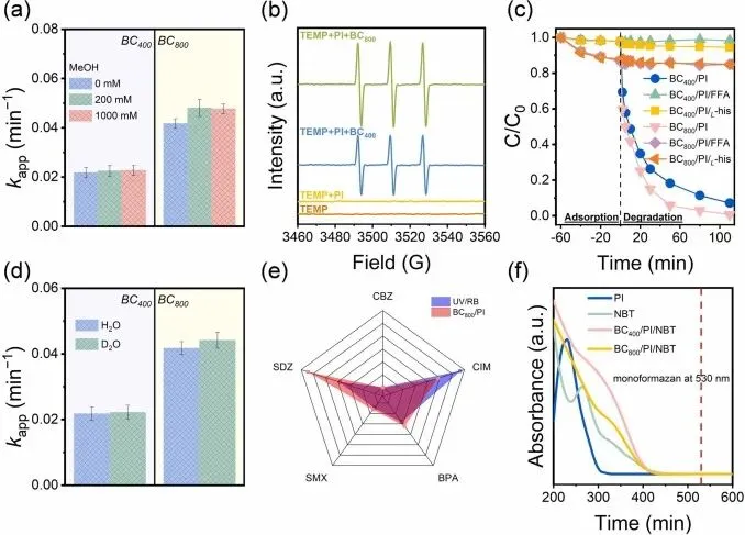 Fig. 3. (a) Effects of MeOH on the oxidation rate of SDZ in BC/PI systems, (b) EPR spectra obtained with 2,2,6,6-tetramethyl-4-piperidinol (TEMP) as a spin-trapping agent, effects of (c) FFA, L-his, or (d) solvent exchange on SDZ elimination, (e) kapp (min−1) of five organic pollutants oxidation by UV/RB and BC800/PI systems, (f) UV–vis absorption spectra of NBT in different systems (Experimental conditions: [BC] = 0.2 g L−1, [pollutants] = 20 μM (BC/PI) or 0.15 mM (UV/RB), [PI] = 0.25 mM, [TEMP] = 50 mM, [FFA] = [L-his] = 10 mM, initial pH: 7).