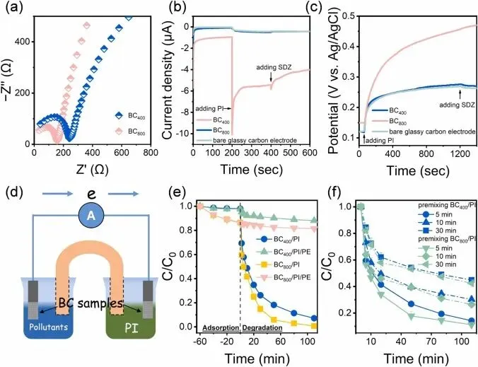 Fig. 4. (a) Electrochemical impedance characterization of BC, and (b) chronoamperometry and (c) open-circuit potential characterizations of the BC/PI systems, (d) schematic illustration of the GOP system, effects of (e) PE and (f) premixing BC and PI on SDZ elimination in BC/PI systems (Experimental conditions: [BC] = 0.2 g L−1, [SDZ] = 20 μM, [PI] = 0.25 mM, [PE] = 5 mM, initial pH: 7).