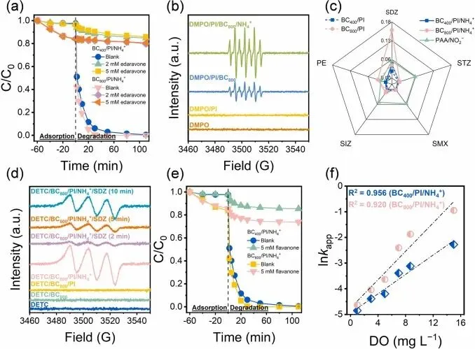 Fig. 5. (a) Effects of edaravone on SDZ elimination in BC/PI/NH4+ systems, (b) EPR spectra obtained with 5,5-Dimethyl-1-pyrroline N-oxide (DMPO) as a spin-trapping agent, (c) kapp (min−1) of five organic pollutants oxidation by PAA/NO2−, BC/PI, and BC/PI/NH4+ systems, (d) EPR spectra obtained with (DETC)2-Fe2+ as a spin-trapping agent, (e) effects of flavanone on SDZ elimination in BC/PI/NH4+ systems, (f) correlations between the DO concentration and the lnkapp in BC/PI/NH4+ systems. (Experimental conditions: [BC] = 0.2 g L−1, [pollutants] = 20 μM, [PAA] = 0.15 mM, [PI] = 0.25 mM, [DMPO] = 100 mM, [DETC] = 50 mM, [NH4+] = 10 mM, [NO2−] = 20 mM, initial pH: 7).本研究表明,NH₄⁺通过将主导活性物种从•IO₃转移至RNS(尤其是NO₂•),显著增强了BC/PI体系中的SDZ降解效率。机理研究揭示,相较于•IO3,NO2•与SDZ的反应动力学更具优势,主要源于其氧化SDZ脆弱位点(如磺酰胺氢原子和芳香氮原子)的能量障碍更低。然而,NO2•介导的反应促进了硝基副产物形成,液相色谱-四极杆飞行时间质谱(LC-QTOF-MS)鉴定出硝基酚衍生物。毒性预测表明,多种硝基中间体展现出高于母体SDZ的急性与慢性生态毒性。研究揭示了NH₄⁺在SDZ降解过程中BC/PI体系中的双重特性:既增强了污染物降解效率,又通过毒性副产物形成意外提升了生态风险。这强调了实施PI-AOP工艺时需审慎评估共存无机离子的必要性。本研究局限在于缺乏硝基副产物(如硝基酚类)的定量分析,导致环境风险评估不够精准。后续研究可聚焦于量化这些有毒中间体,以更准确评估BC/PI系统在废水处理中的实际应用价值。