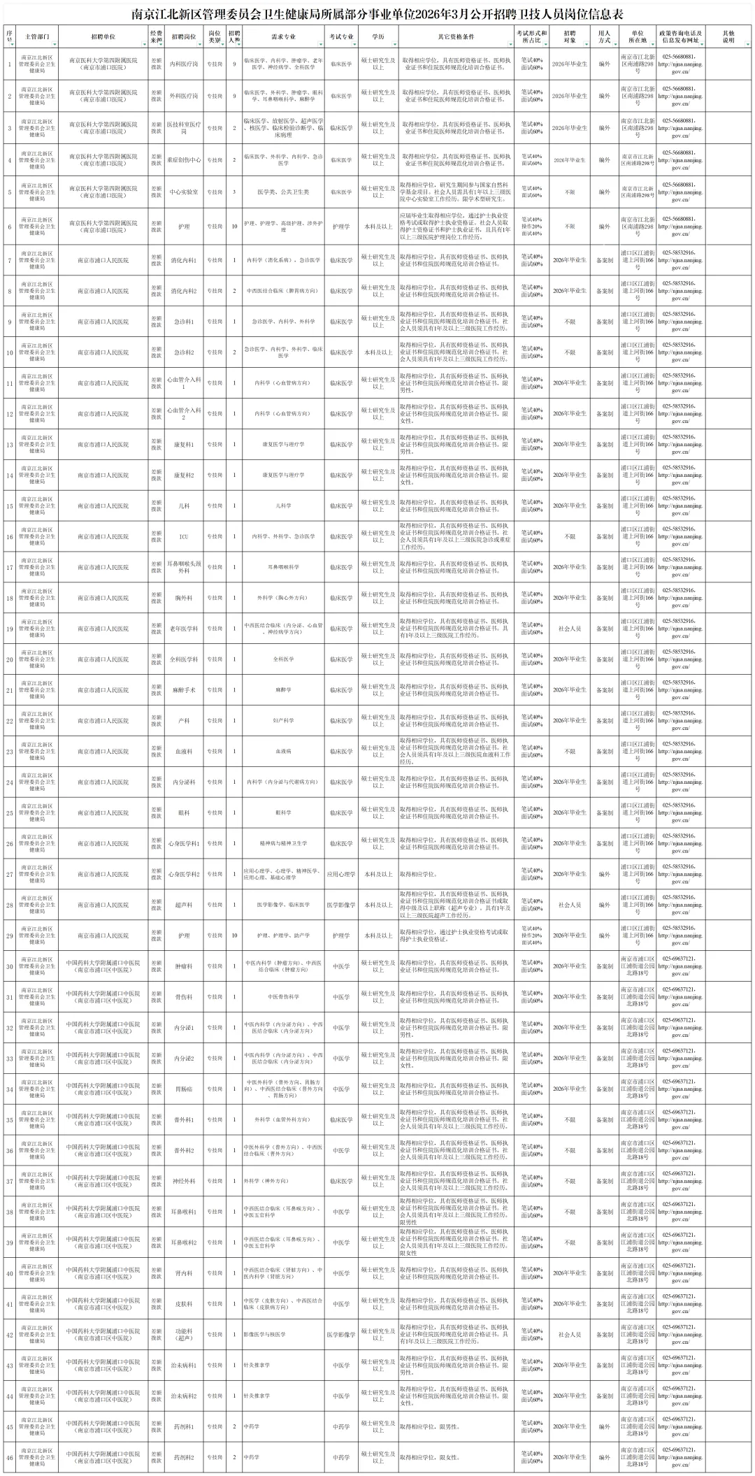 本次招聘相关信息在南京江北新区管理委员会网上发布。具体的招聘岗位、数量、资格条件等详见《南京江北新区管理委员会卫生健康局所属部分事业单位2026年3月公开招聘卫技人员岗位信息表》(以下简称《岗位信息表》)。