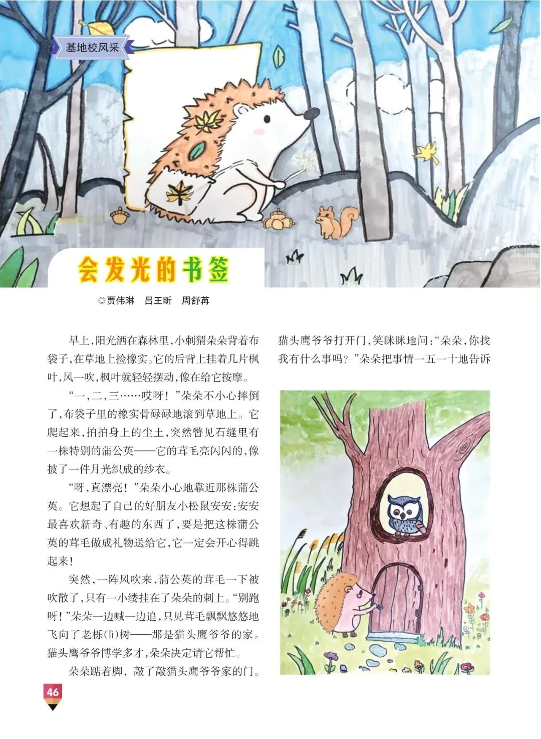 突然,一阵风吹来,蒲公英的茸毛一下被吹散了,只有一小缕挂在了朵朵的刺上。“别跑呀!”朵朵一边喊一边追,只见茸毛飘飘悠悠地飞向了老栎(lì)树——那是猫头鹰爷爷的家。猫头鹰爷爷博学多才,朵朵决定请它帮忙。
