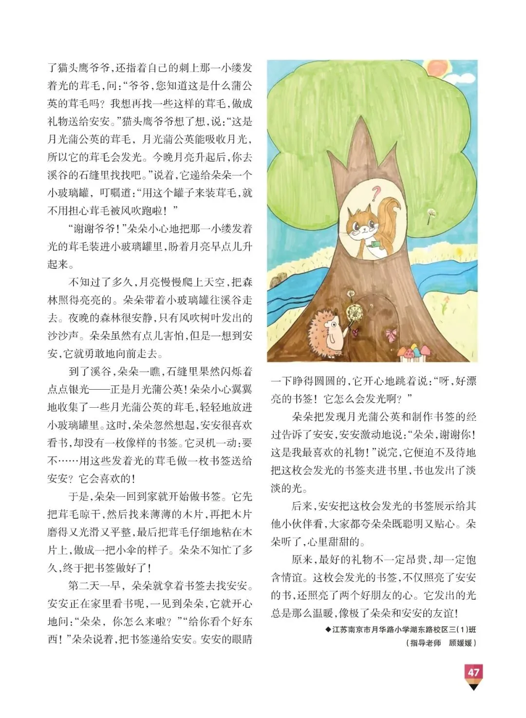朵朵把发现月光蒲公英和制作书签的经过告诉了安安,安安激动地说:“朵朵,谢谢你!这是我最喜欢的礼物!”说完,它便迫不及待地把这枚会发光的书签夹进书里,书也发出了淡淡的光。
