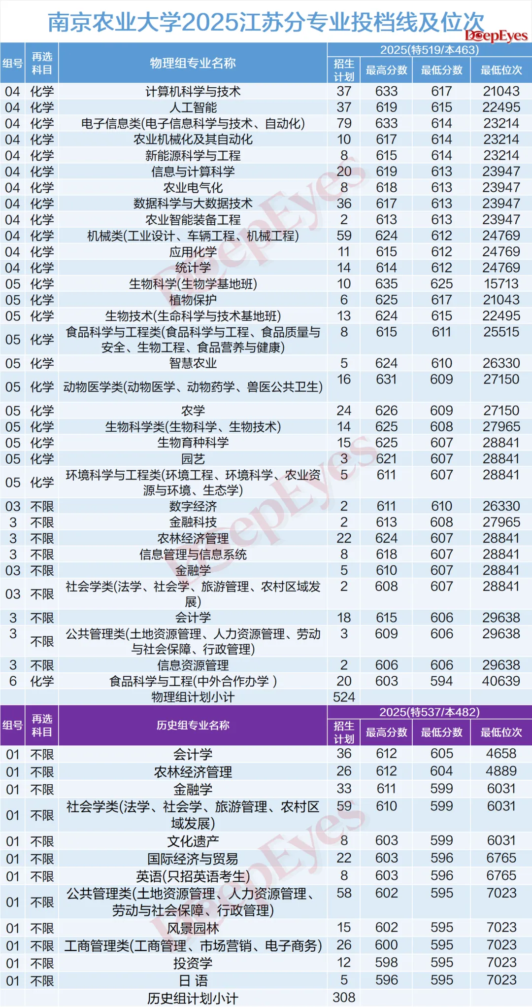 二、2025 江苏投档数据:工科 / 农学 / 经管全覆盖,梯度清晰南农今年分物理组、历史组招生,专业组全是农学 / 工科 / 经管 / 公共管理实用型专业,无冷门坑位,分数梯度适配不同分段考生:(一)物理组:工科领跑,王牌农学 / 生科紧随,覆盖 15713-40639 位次