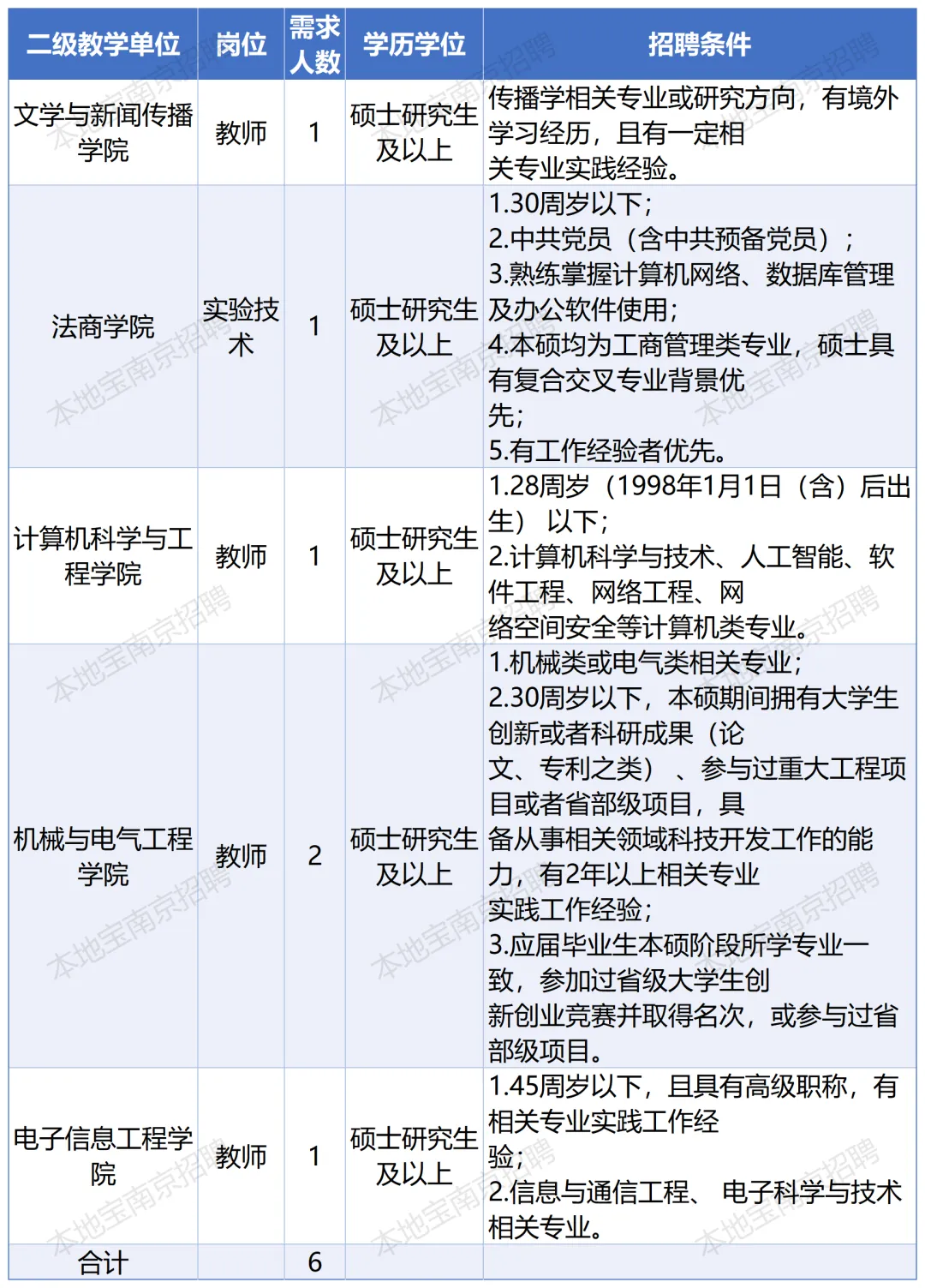 6. 年龄一般不超过30周岁(1996年1月1日(含)后出生);具有副高及以上职称或博士学位,并有高校教学经验或相关专业实践工作经验的,年龄一般不超过45周岁(1981年1月1日(含)后出生)。特别优秀者,年龄可适当放宽。