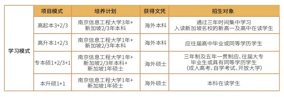 项目由南京信息工程大学与新加坡院校共同研发,学生在南京信息工程大学学习1-3年国际预科课程,圆满完成国内阶段课程后,直通新加坡开设的大学就读本科课程。学生在新加坡约2年完成本科学业后,可攻读国内外名校硕士。报读本项目的学生,在海外本硕连读用时约3年,即可轻松获得海外一流大学硕士学位,毕业文凭受中国(教育部)留学服务中心认证,可报考选调生、国家事业单位、公务员,参与江浙沪地区人才引进计划,并有机会入职世界500强企业。