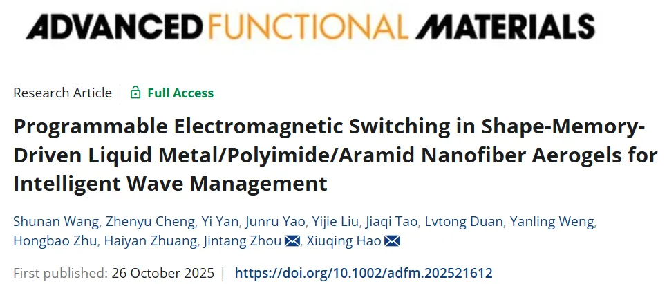Shunan Wang, Zhenyu Cheng, Yi Yan, Junru Yao, Yijie Liu, Jiaqi Tao, Lvtong Duan, Yanling Weng, Hongbao Zhu, Haiyan Zhuang, Jintang Zhou*, Xiuqing Hao*. Programmable Electromagnetic Switching in Shape-Memory-Driven Liquid Metal/Polyimide/Aramid Nanofiber Aerogels for Intelligent Wave Management. Adv. Funct. Mater. 2025.