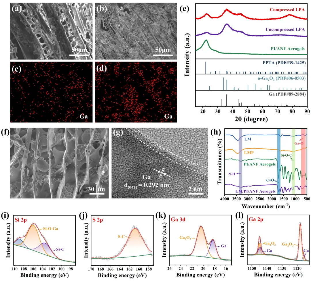 图2. 复合气凝胶的表征。 (a,b)未压缩与压缩后LPA气凝胶的顶面形貌, (c,d) EDS中的Ga元素分布, (e) XRD, (f) 未压缩LPA气凝胶的侧面形貌, (g) TEM, (h) FTIR, (i-l) XPS。