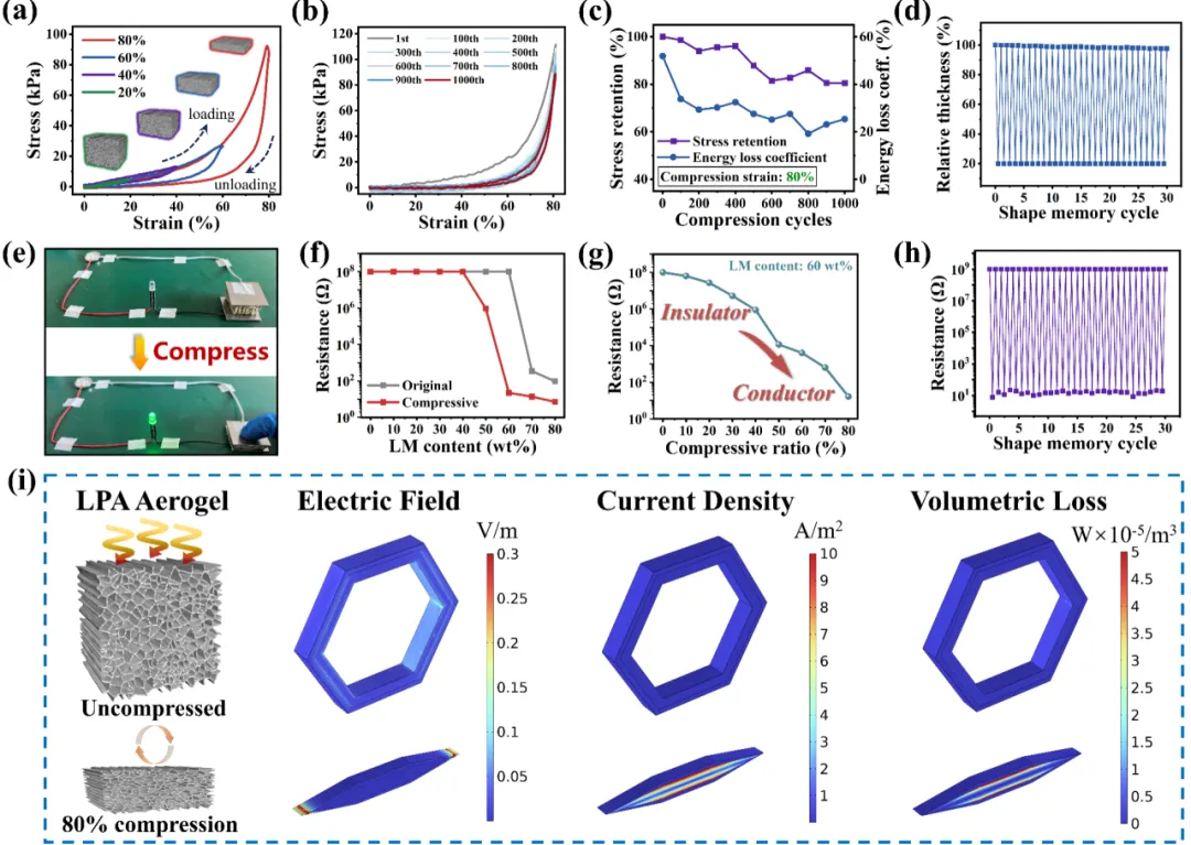 LPA气凝胶凭借其多尺度可调结构与液态金属网络,展现出优异的力学可逆性、电导可编程性及电磁功能可切换性。如图3所示,在外界压缩应变的驱动下,气凝胶的孔隙结构逐渐塌缩、致密,液态金属由分散态转变为连续导电网络,实现了由绝缘态向导电态的可逆转变;得益于形状记忆效应,材料在多次循环压缩与恢复过程中仍能保持稳定的形变回复与导电性能。