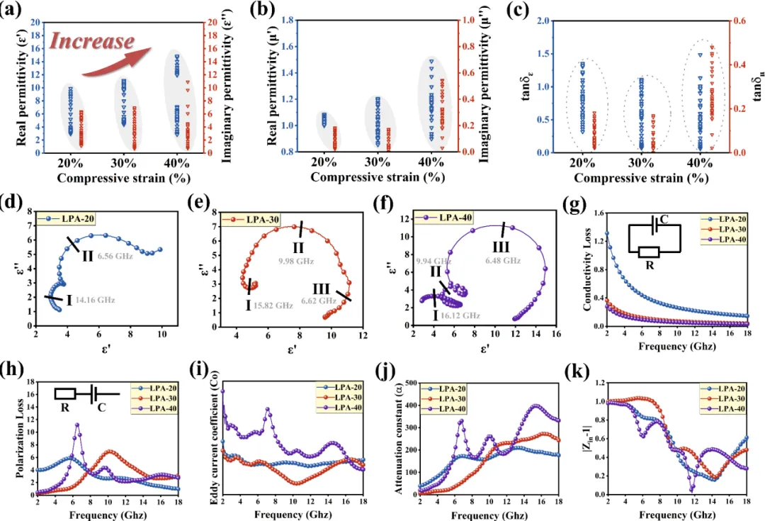 图4. LPA复合气凝胶的电磁参数。 (a) 介电实部和介电虚部, (b) 磁实部和磁虚部, (c) 介电损耗正切值和磁损耗正切值, (d-f) LPA-20,LPA-30,LPA-40的Cole-Cole圆, (g) 导电损耗, (h) 极化损耗, (i) 涡流损耗因子, (j) 衰减常数, (k) 空气阻抗匹配。