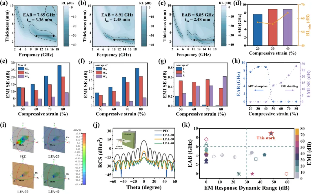 图5. LPA复合气凝胶的电磁切换功能。 (a-c) 电磁吸波性能, (d) EAB and RLmin, (e-g) 电磁屏蔽性能, (h) 不同压缩应变下的电磁切换性能, (i) 3D雷达波散射信号图, (j) 不同角度的RCS仿真曲线, (k) 电磁切换功能对比。