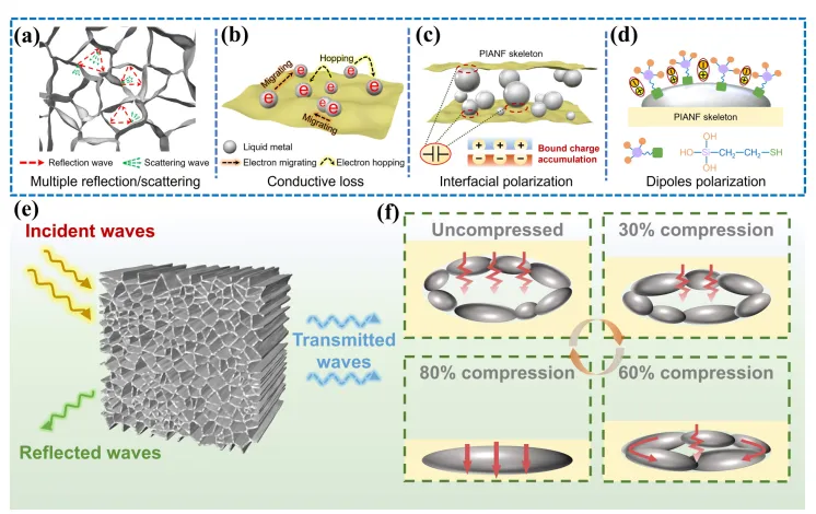 图6. LPA复合气凝胶的电磁切换功能机理。 (a) 多重反射与散射, (b) 电导损耗, (c) 界面损耗, (d) 偶极极化, (e) 电磁波入射路径, (f) 电流路径随压缩应变的变化。