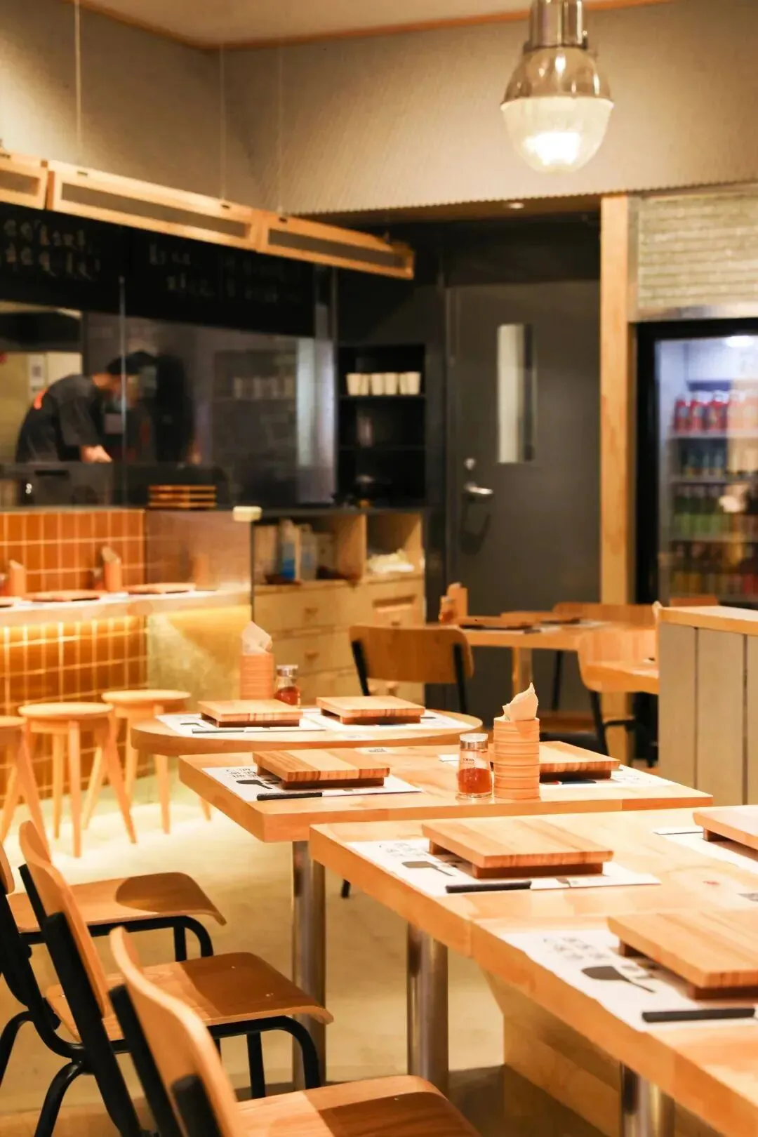 三层的空间里,是简约又不失质感的设计:原木色的桌椅温柔治愈,挑高的天窗把天光引进室内,阳光好的时候,光影落在桌面上,连吃饭都变成了一件浪漫的事。通透的落地窗、暖黄的灯光,还有随处可见的火山元素细节,悄悄呼应着「火山屋台」的名字,现代感的设计和老门东的古意碰撞,生出一种恰到好处的松弛感。