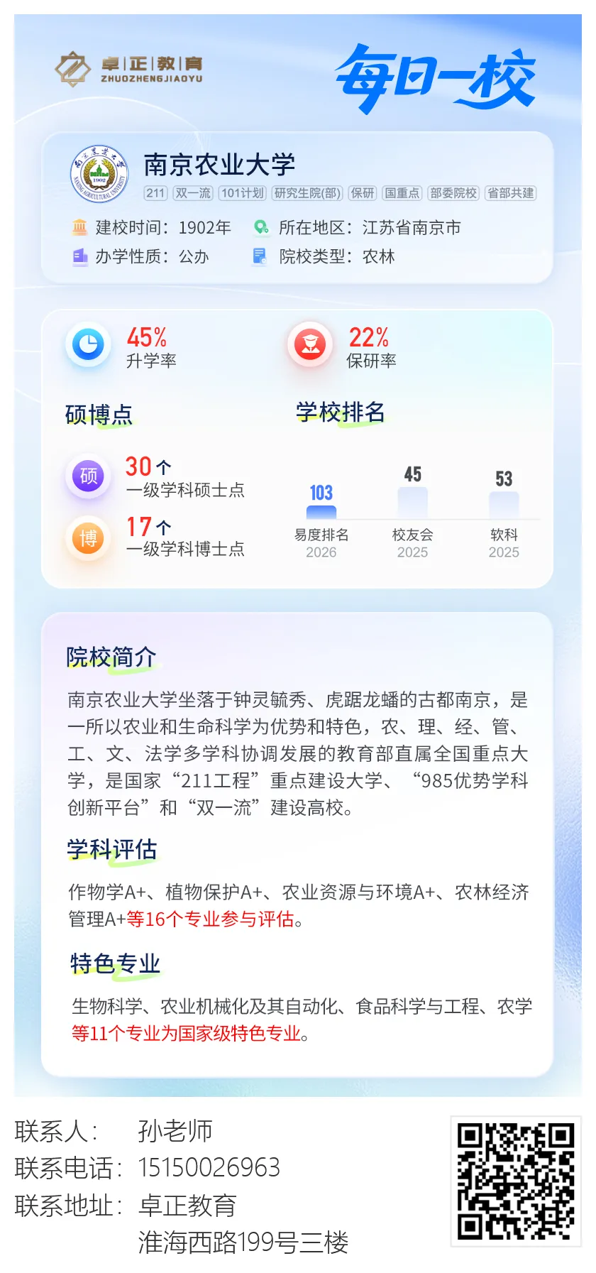智能择校 | 一键填报 | 智能分析 | 志愿表导出来源 | 文字内容来源于南京农业大学官网综合整理。(声明:“卓正生涯”微信公众号刊载此文,是出于传递更多信息之目的。若侵犯了您的合法权益,请及时与我们联系,我们将及时更正、删除。)喜欢本文请分享到朋友圈让更多人看到吧~
