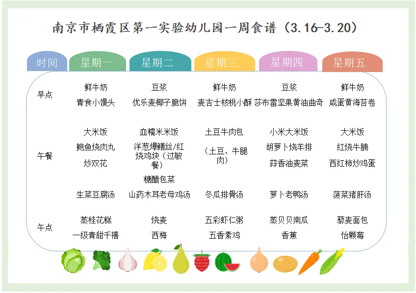 >【畅美食刻】南京市栖霞区第一实验幼儿园一周食谱(3.16-3.20)
