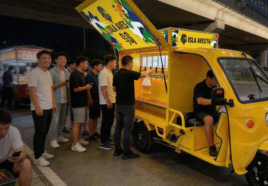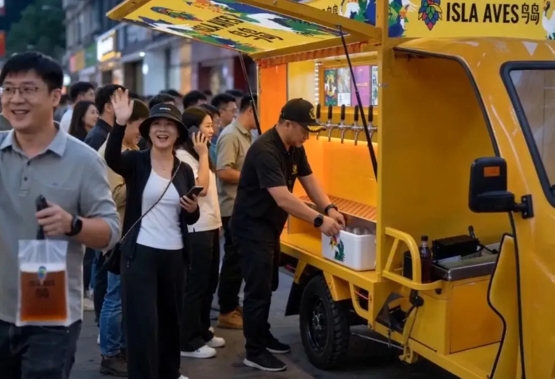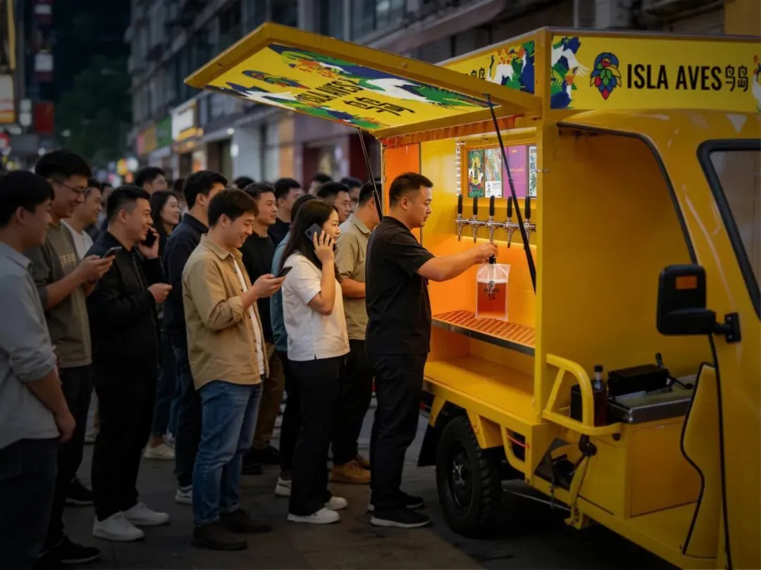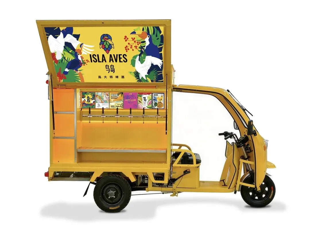 全新电动三轮车移动打酒模式。车上载着高大师最受欢迎的鸟岛、婴儿肥等新鲜啤酒,走街串巷、可以外卖,人多即卖,轻松开启增收创业路。