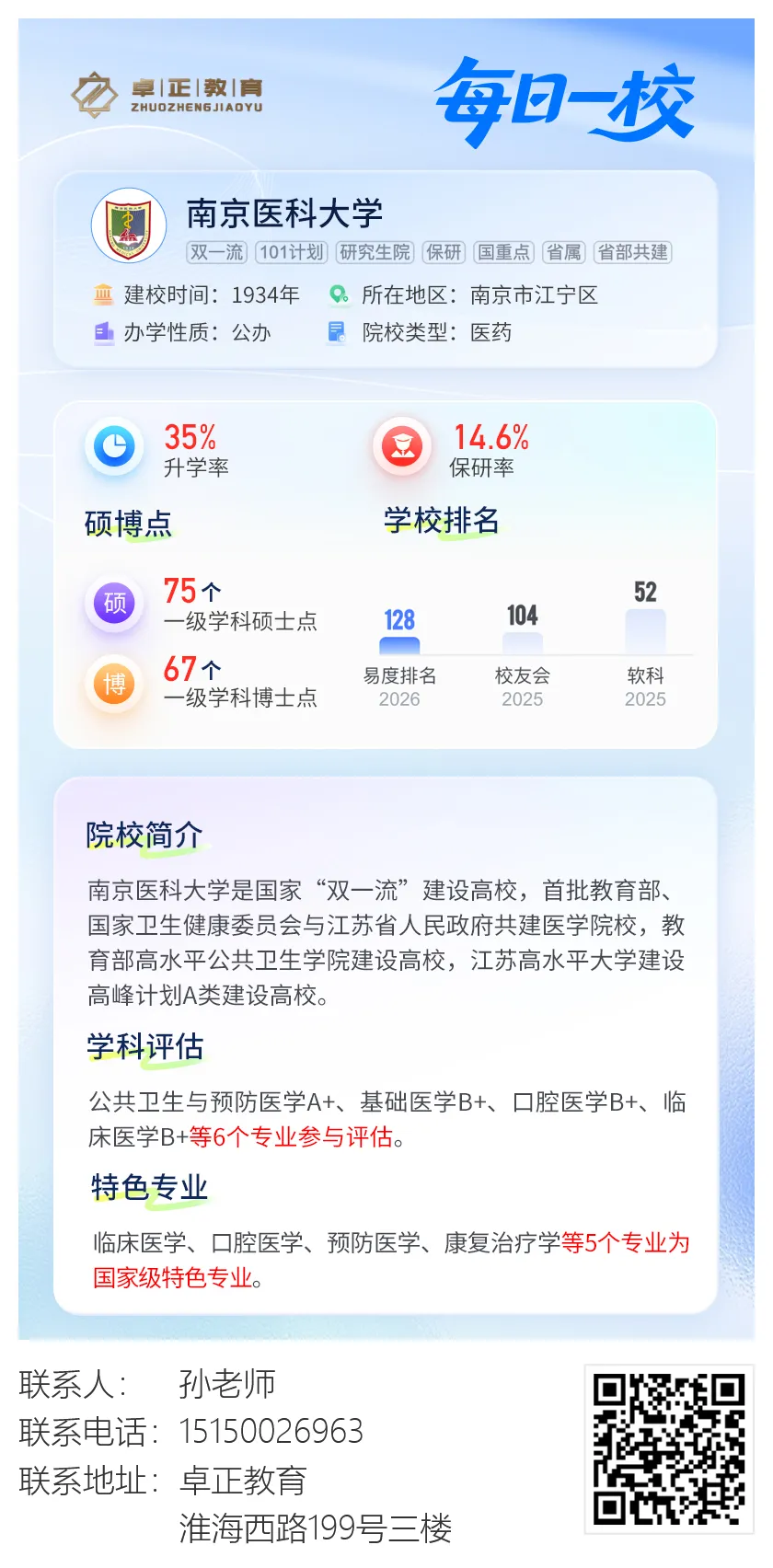 智能择校 | 一键填报 | 智能分析 | 志愿表导出来源 | 文字内容来源于南京医科大学官网综合整理。(声明:“卓正生涯”微信公众号刊载此文,是出于传递更多信息之目的。若侵犯了您的合法权益,请及时与我们联系,我们将及时更正、删除。)喜欢本文请分享到朋友圈让更多人看到吧~