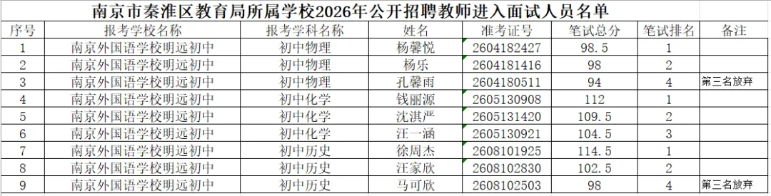 南京教师招聘||南京市钟英中学2026年公开招聘新教师进入面试人员名单公示