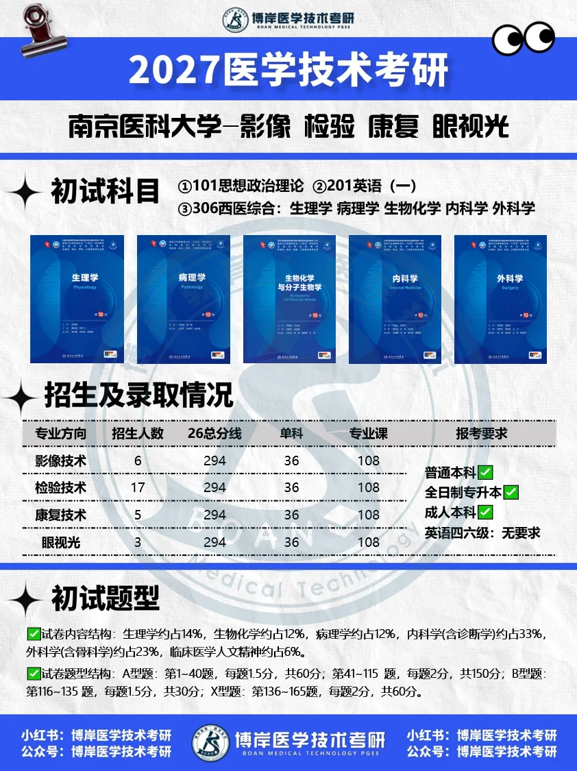 ✅招生 & 录取:影像招 6 人、检验 17 人、康复 5 人、眼视光 3 人;总分线 294,单科线 36(公共课)/108(专业课);普本、全日制专升本、成人本科均可报,四六级无要求!